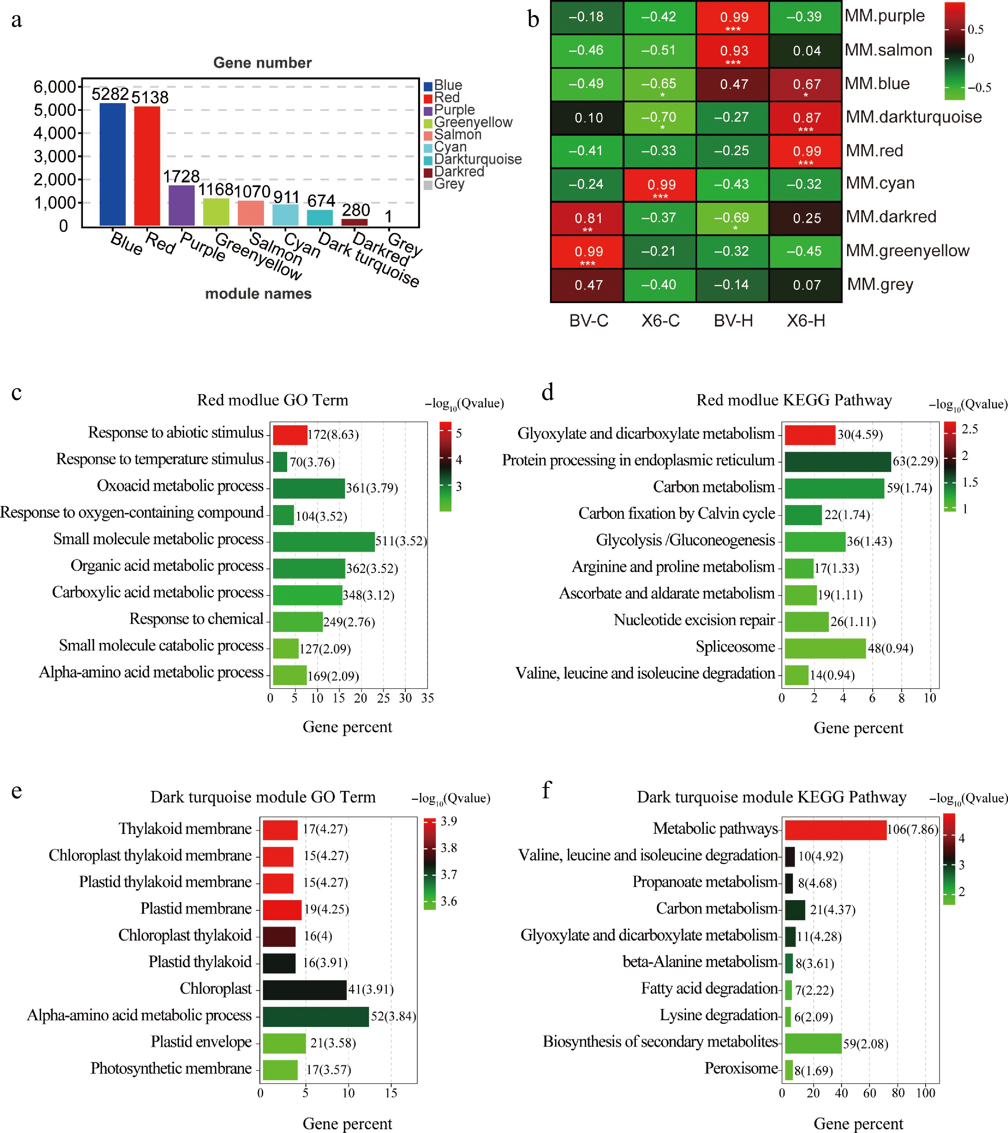 Weighted gene co-expression network analysis (WGCNA) of modules comprising specific DEGs in heat-treated 'X6' (X6-H) and GO and KEGG analysis of these specific DEGs. (a) Number of DEGs in eight modules generated from WGCNA. (b) Modules and traits correlation analysis pinpointed that the Red module and the Dark turquoise module had significant correlations with 'X6-H'. (c), (d) Top ten GO and KEGG enriched terms for DEGs in the Red module. (e), (f) Top ten GO and KEGG enriched terms for DEGs in the Dark turquoise module.