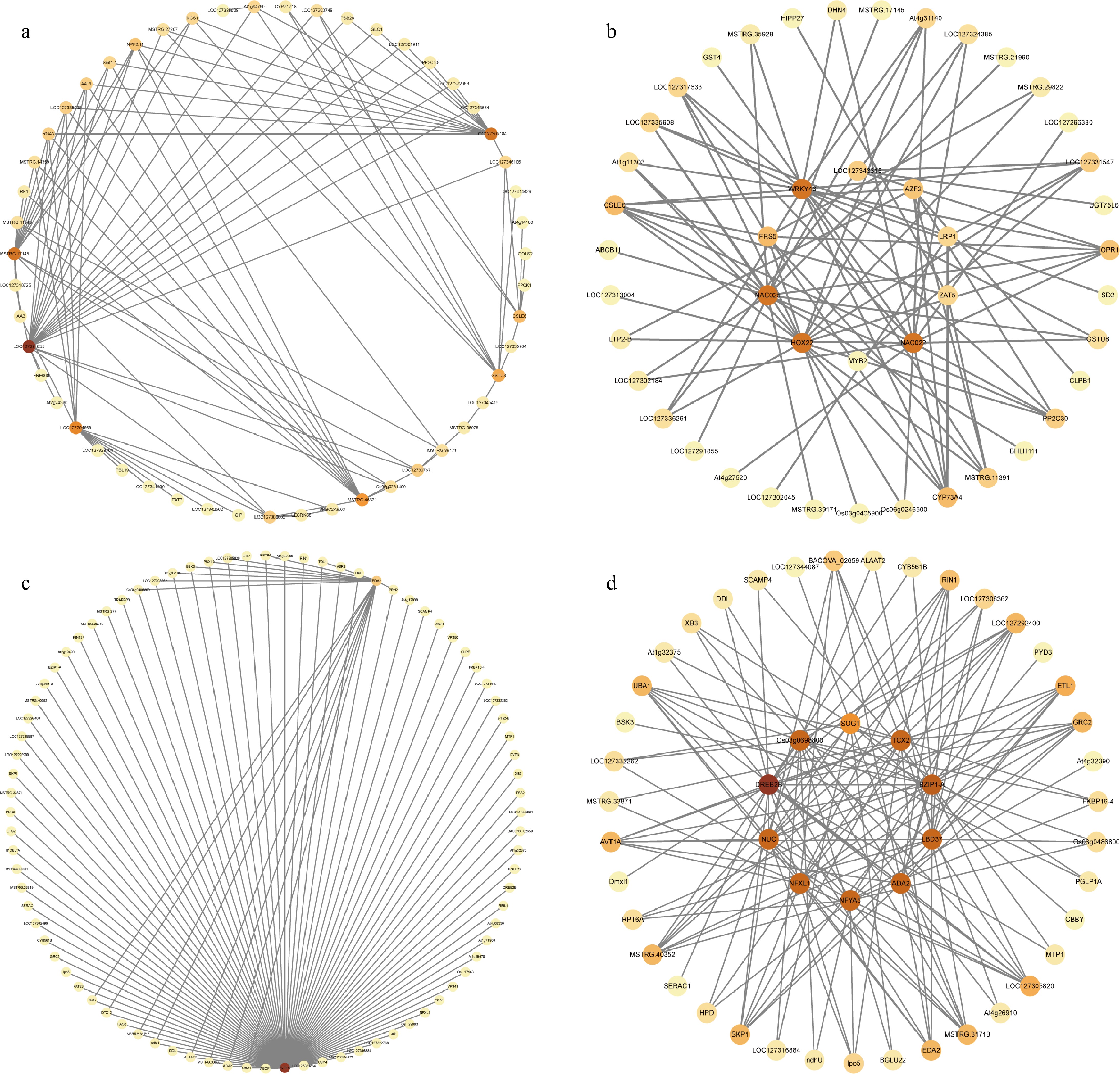 Gene co-expression network analysis of modules comprising specific DEGs in heat-treated 'X6' (X6-H). (a), (b) Co-expression network of the top 100 genes with connectivity and the top ten transcription factors with connectivity in the Red module. (c), (d) Co-expression network of the top 100 genes with connectivity and the top ten transcription factors with connectivity in the Dark turquoise module.