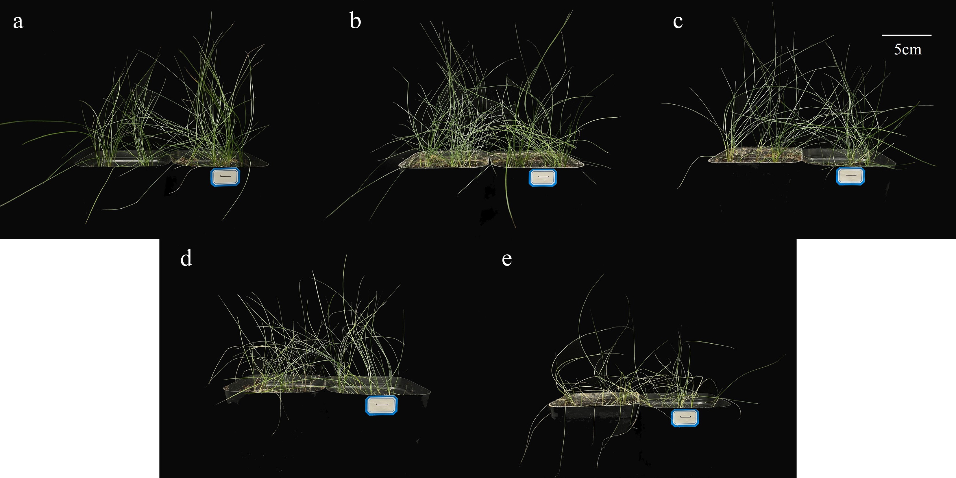 Effects of different concentrations of salt stress on the phenotype of F. rubra. (a) Control. (b) Salt concentration 0.5%. (c) Salt concentration 1%. (d) Salt concentration 2%. (e) Salt concentration 3%. The scale bar (5 cm) is shown on the figure.