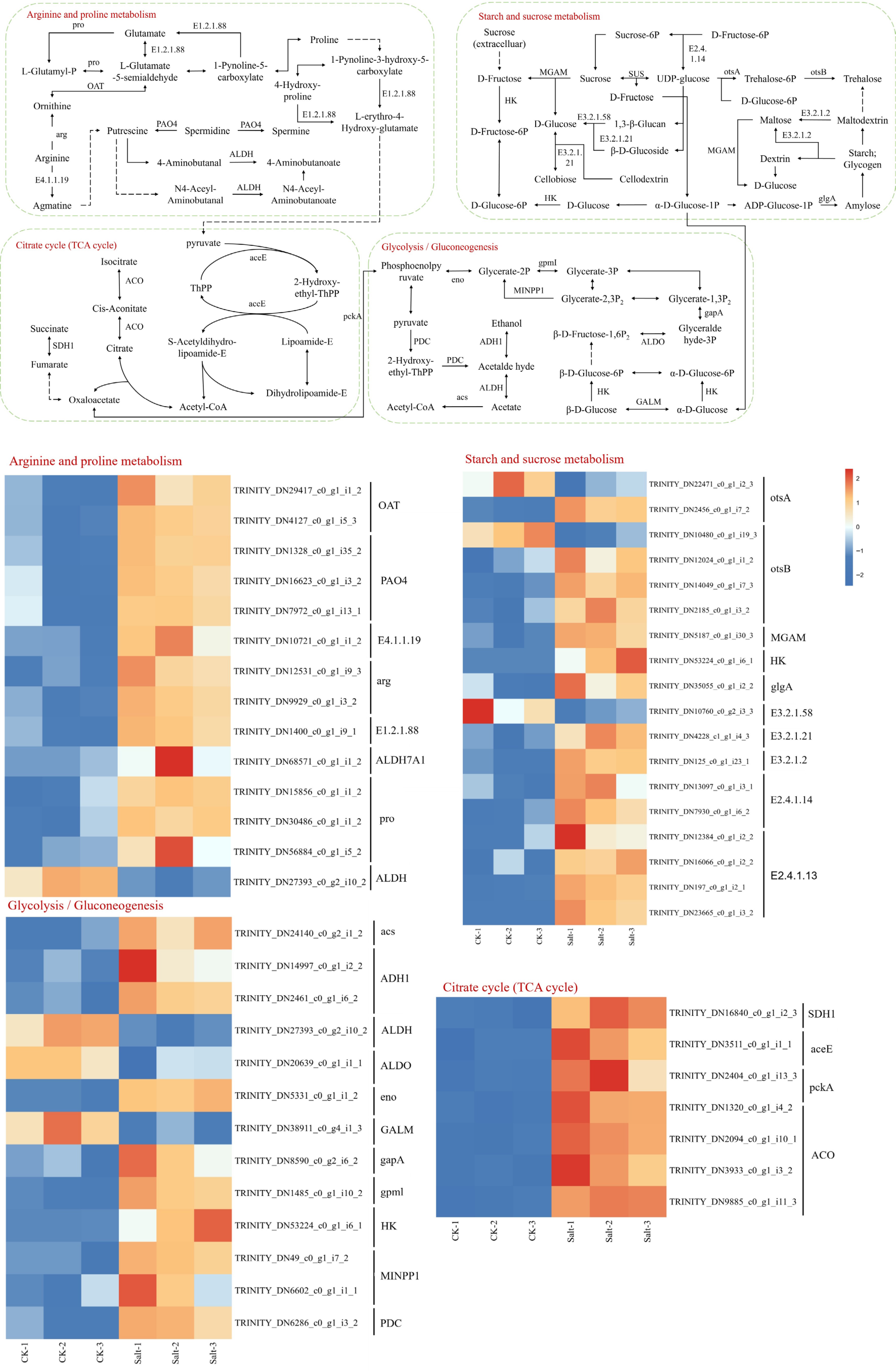 Within amino acid metabolism, the arginine and proline biosynthesis pathway exhibited pronounced upregulation under salt stress, functionally interconnected with the citric acid (TCA) cycle through pyruvate (Fig. 9). Key enzymes driving this activation included E1.2.1.88 (glutamate-5-semialdehyde dehydrogenase), E4.1.1.19 (argininosuccinate lyase), arg (arginase), OAT (ornithine aminotransferase), PAO4 (polyamine oxidase), and proB (γ-glutamyl kinase), collectively enhancing proline synthesis while replenishing TCA intermediates via anaplerotic reactions. Notably, ALDH (aldehyde dehydrogenase), a bifunctional enzyme participating in both glycolysis/gluconeogenesis and oxidative stress responses, was downregulated.