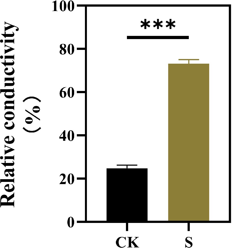 • The healthy leaves of the same size were selected, cleaned, and cut into small pieces, placed in a centrifuge tube containing deionized water, and placed in a shaker at room temperature for 24 h. After the oscillation, the conductivity (R1) of the extract was measured by a conductivity meter (DDSJ-318). Subsequently, the test tube was heated in a boiling water bath for 30 min, and the conductivity (R2) was measured again after cooling to room temperature. The relative conductivity of the blade is calculated by the formula = (R1/R2) × 100%.