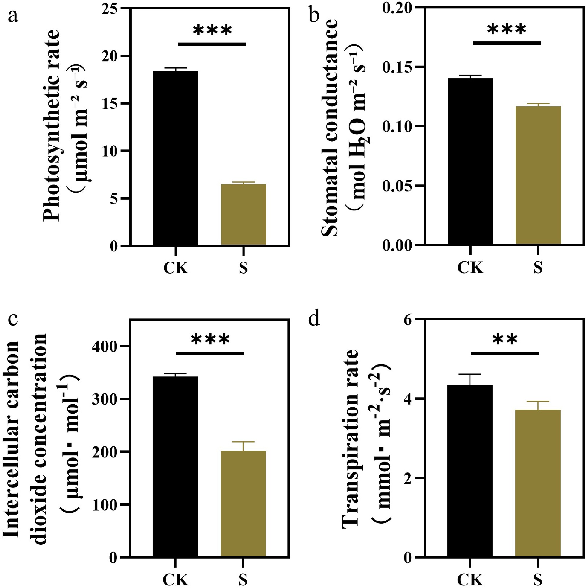 Effects of salt stress treatments on photosynthetic parameters of F. rubra. (a) Net photosynthetic rate. (b) Stomatal conductance. (c) Intercellular CO2 concentration. (d) Transpiration rate. Values are means ± SE (n = 3 biological replicates). After t-test, the value bars with ns are not significant, asterisk denotes statistically significant differences * p < 0.05; ** p < 0.01; *** p < 0.001.