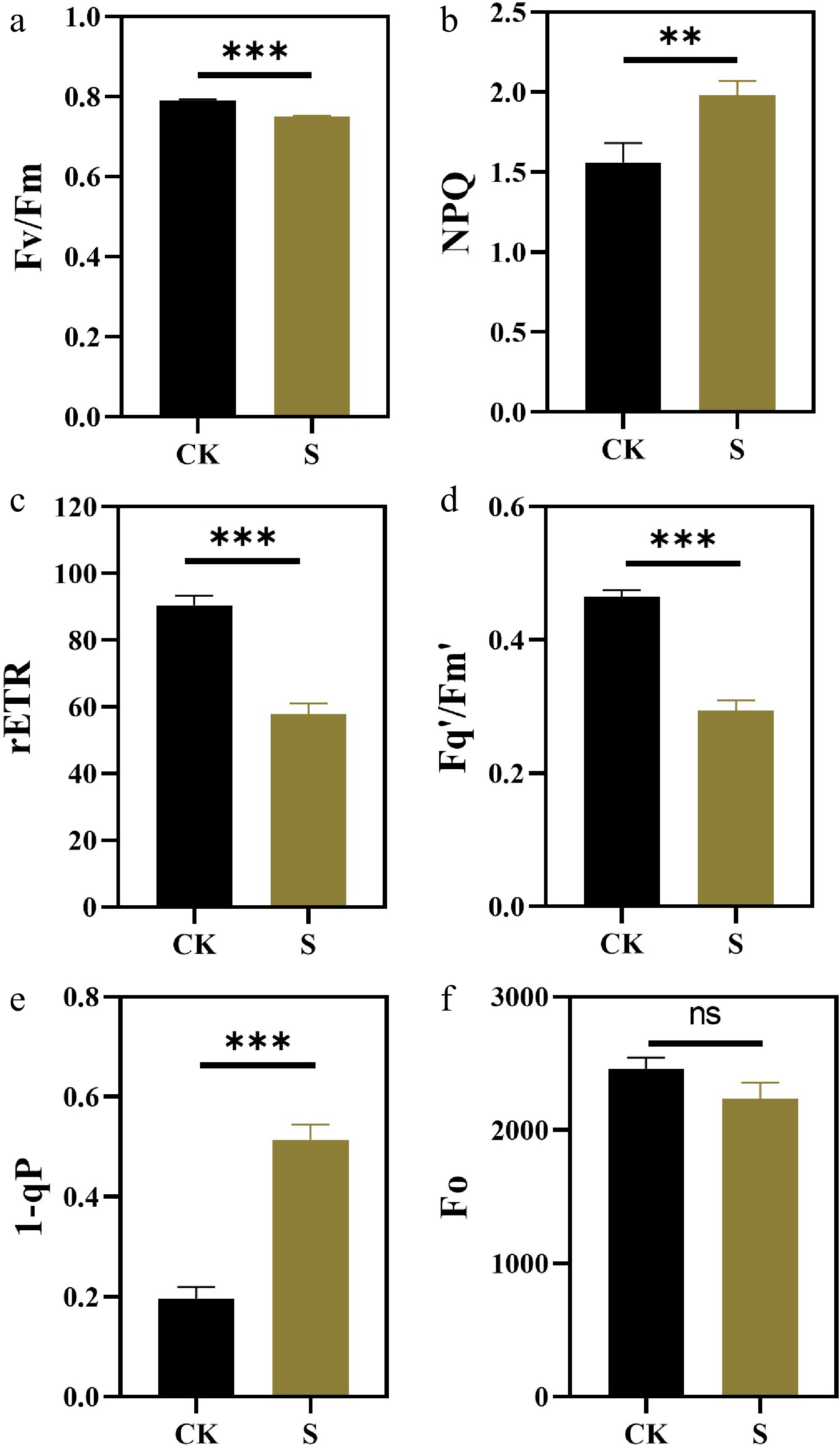Effects of salt stress treatments on chlorophyll fluorescence parameters of F. rubra (a) PSII maximum photochemical efficiency (Fv/Fm). (b) Non-photochemical quenching NPQ. (c) Photosynthetic linear electron transport rate (rETR). (d) PSII operating efficiency Fq'/Fm'. (e) Reaction center closure degree 1-qP. (f) Initial fluorescence Fo. Values are means ± SE (n = 3 biological replicates). After t-test, the value bars with ns are not significant, asterisk denotes statistically significant differences * p < 0.05; ** p < 0.01; *** p < 0.001.