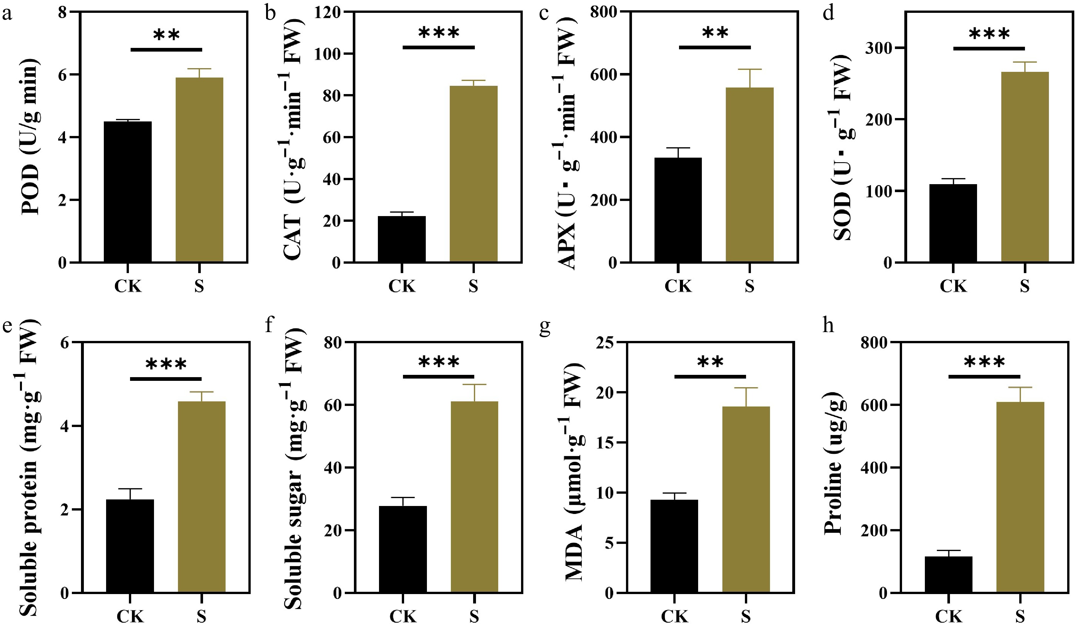 • The stress response of plants is usually related to the production of ROS. To determine the level of ROS in plants under salt stress, the activity of various antioxidant enzymes and the content of MDA in the leaves were measured. MDA indicates the degree of lipid damage caused by ROS. Compared with the control, the MDA content increased significantly under salt conditions (Fig. 5g). All antioxidant enzyme activities were significantly increased under salt stress. Compared with POD (Fig. 5a), APX, SOD, and CAT were more sensitive to salt stress (Fig. 5bd).