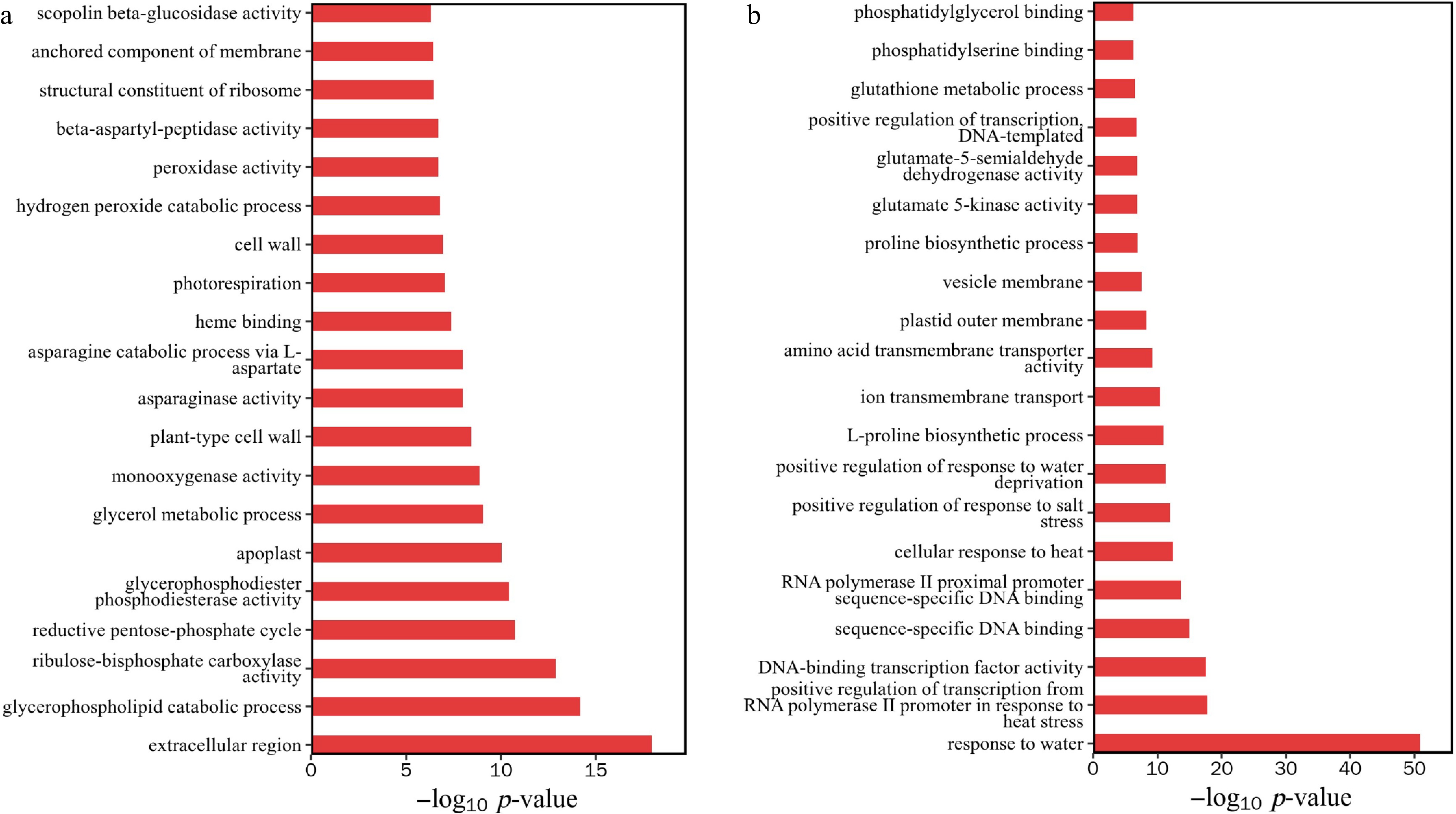 GO enrichment analysis of differentially expressed genes. (a) Downregulation of gene enrichment function p-value top 20. (b) Upregulation of gene enrichment function p-value top 20.