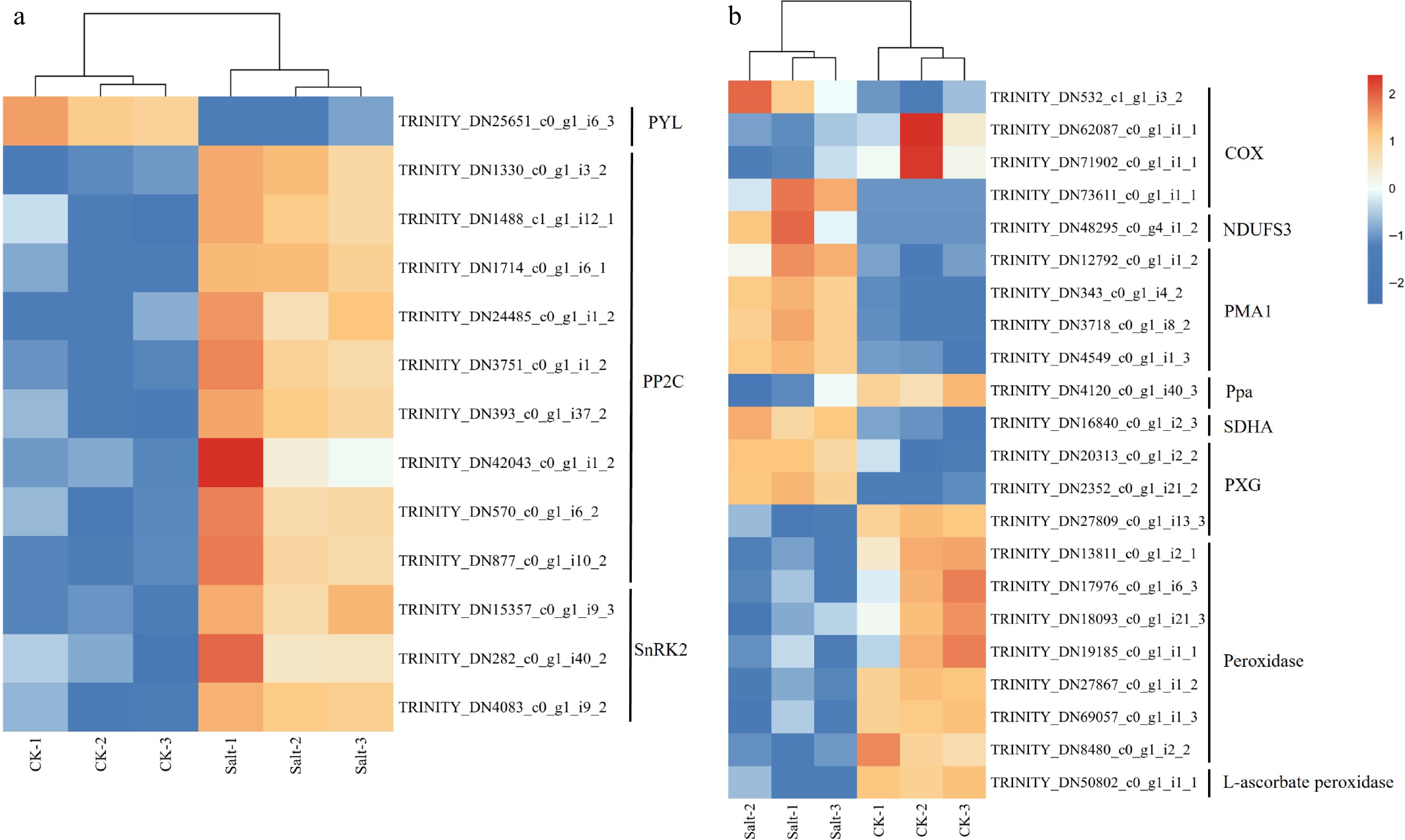 Gene expression heat map of F. rubra. (a) Expression profiles of transcripts involved in abscisic acid. (b) Expression profiles of transcripts involved in peroxidase activity and oxidative phosphorylation. Expression levels are displayed as log2-transformed FPKM values (Fragments Per Kilobase per Million mapped reads). Color scale indicates relative expression levels: red (upregulation), and blue (downregulation).