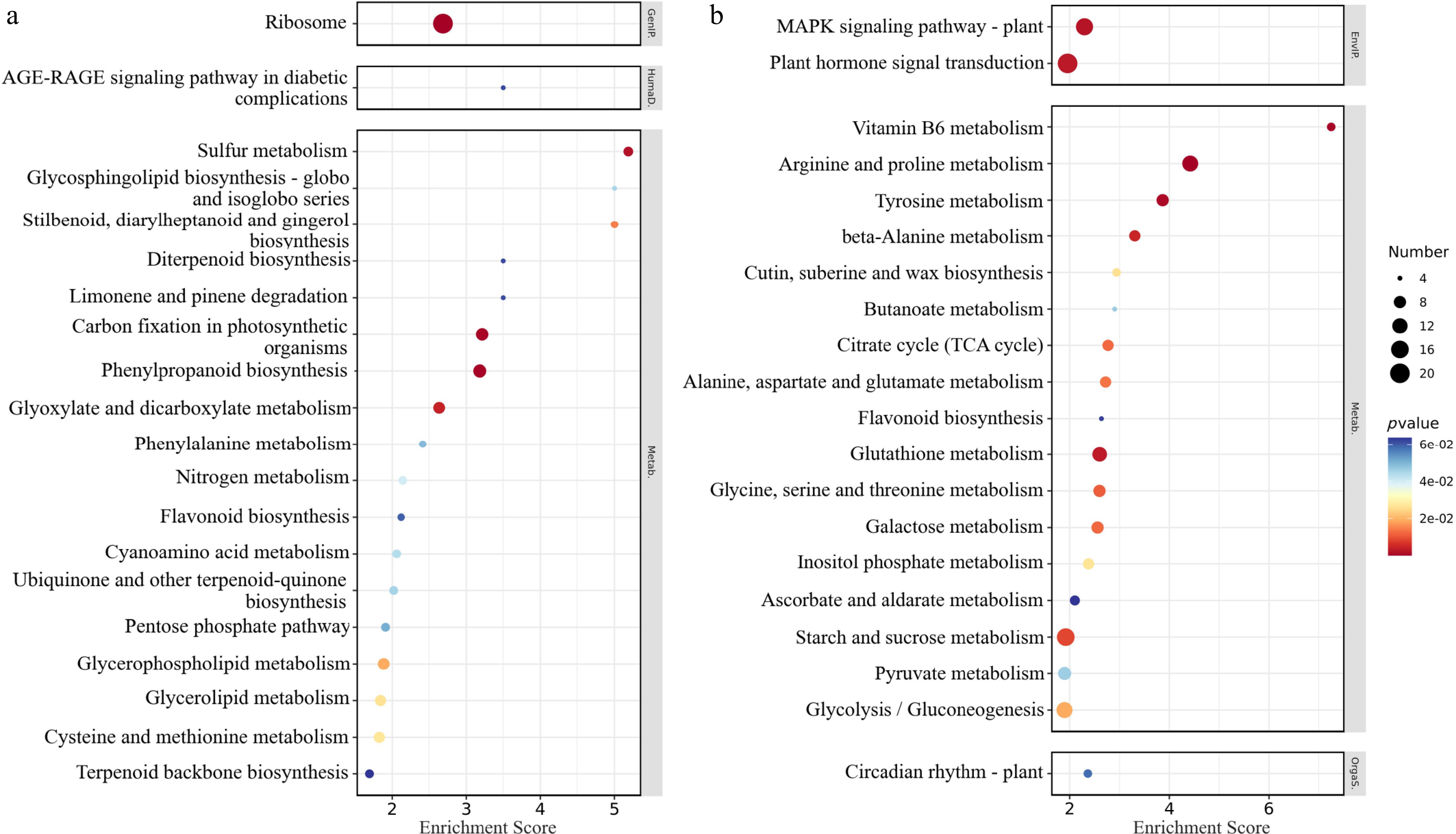 • KEGG enrichment analysis revealed distinct pathway modulation under experimental conditions: the ribosome pathway was the most significantly downregulated (Fig. 9a), whereas plant hormone signal transduction dominated upregulated pathways (Fig. 9b). Collectively, the pathways with more significant KEGG enrichment were mainly concentrated in signal transduction and stress response, carbohydrate metabolism, amino acid metabolism, nitrogen metabolism, redox homeostasis, lipid metabolism, and nitrogen metabolism.