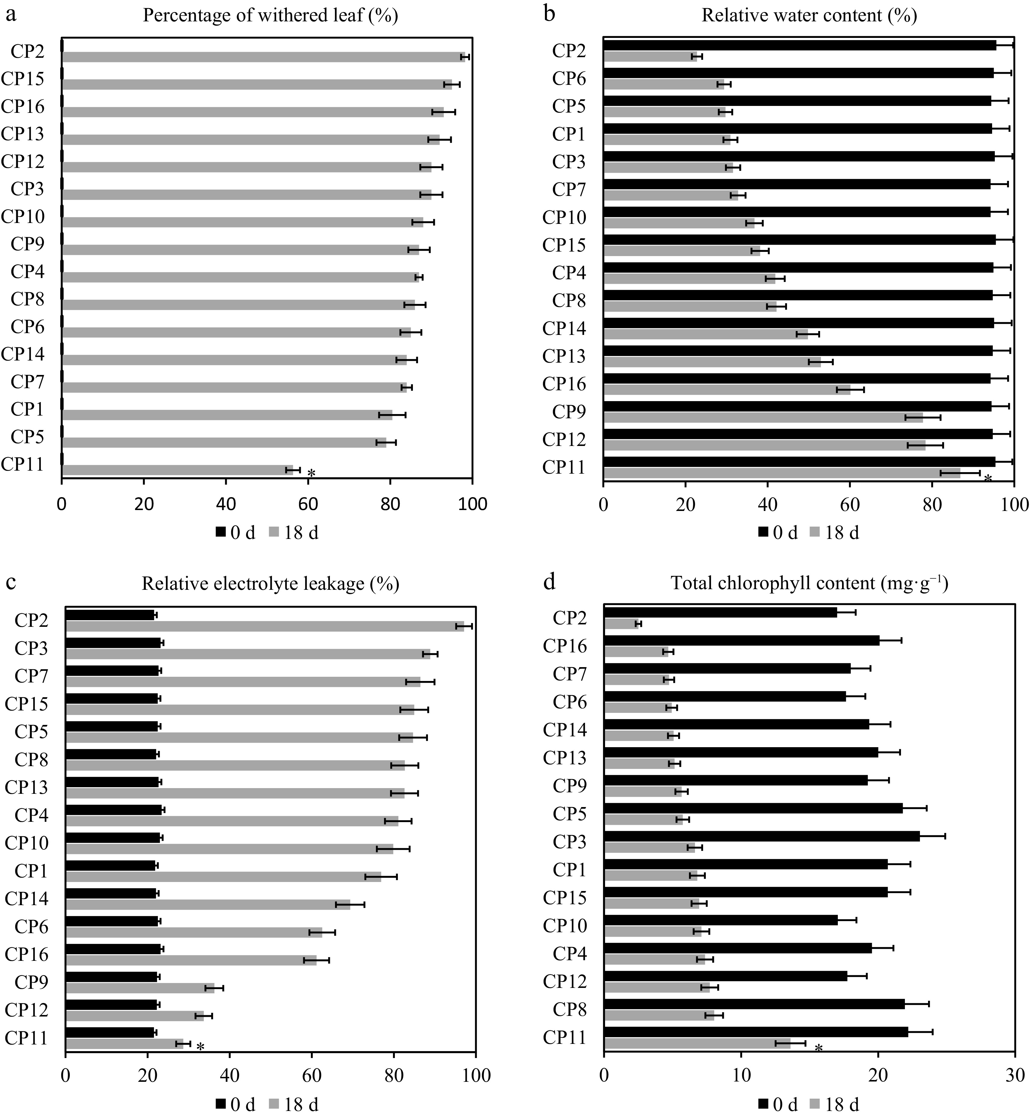 Physiological responses of 16 centipedegrass genotypes to the 99% shade treatment after 18 d. Comparison of physiological responses across 16 centipedegrass genotypes (CP1–CP16) under the control (full light, 0 d) and 99% shade (18 d) conditions. (a) Leaf wilting rate (%), (b) relative water content (RWC, %), (c) relative conductivity (RC, %), (d) total chlorophyll content (mg·g−1). The shade-tolerant genotype CP11 exhibits the lowest wilting rate (56.33%), the highest RWC (86.85%), the lowest RC (28.68%), and the highest chlorophyll retention (13.61 mg·g−1 total), whereas the shade-sensitive CP2 shows the highest wilting rate (98.2%), the lowest RWC (22.8%), the highest RC (97.12%), and the lowest chlorophyll content (2.51 mg·g−1 total). Data represent the means of three biological replicates. An asterisk indicates a significant difference between CP2 and CP11 on Day 18 (p < 0.05).