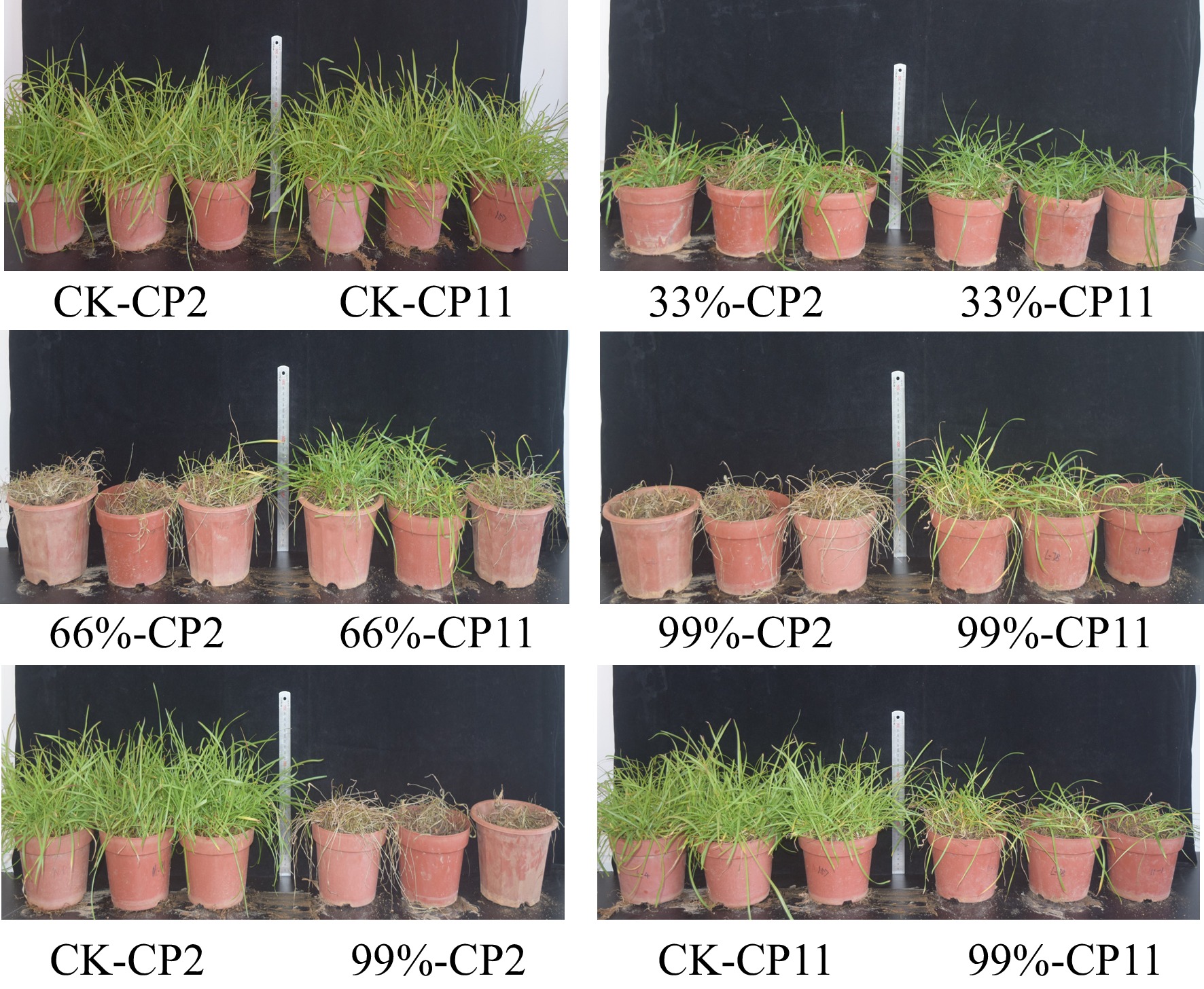 • The pot experiment method was adopted. Healthy, pest-free, and uniformly growing seedlings of CP11 and CP2 centipedegrass were selected from the test site and transplanted into plastic pots with a diameter of 20 cm. After one month of cultivation to ensure that the density and coverage of each pot were basically consistent, the shading treatments were applied. Two shading treatments were established using shading rates of 66% (34% light transmittance) and 99% (near-total shading, with minimal light transmittance), with nonshaded plants serving as the control. The shading treatments were achieved by covering the plants with different layers of shade nets. Leaf and root samples were collected on Days 0, 6, 12 and 18 during the shading stress treatment for index measurement, with three biological replicates per treatment.