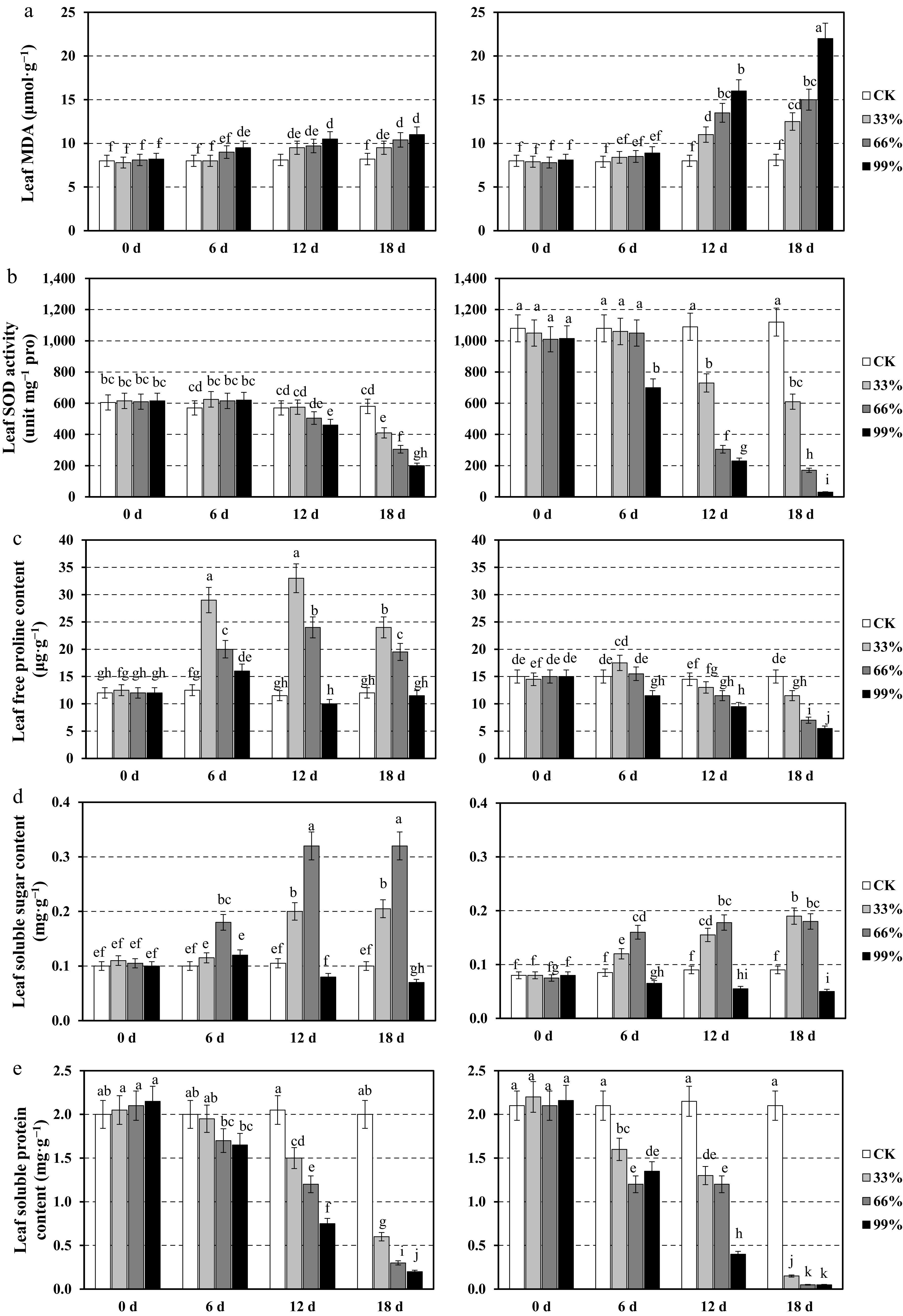 Physiological responses of the leaves in two centipedegrass genotypes, CP11 (left panels) and CP2 (right panels), under different shading levels (CK [control], 33%, 66%, and 99%) over a time course of 0, 6, 12, and 18 d. Data are shown for (a) malondialdehyde (MDA) content (μmol·g−1), (b) superoxide dismutase (SOD) activity (unit mg−1 proline), (c) free proline content (μg·g−1), (d) soluble sugar content (mg·g−1), and (e) soluble protein content (mg·g−1). Values represent the means ± standard error (SE) (n = 3). Different letters indicate statistically significant differences (p < 0.05) according to analysis of variance (ANOVA) followed by post hoc tests.