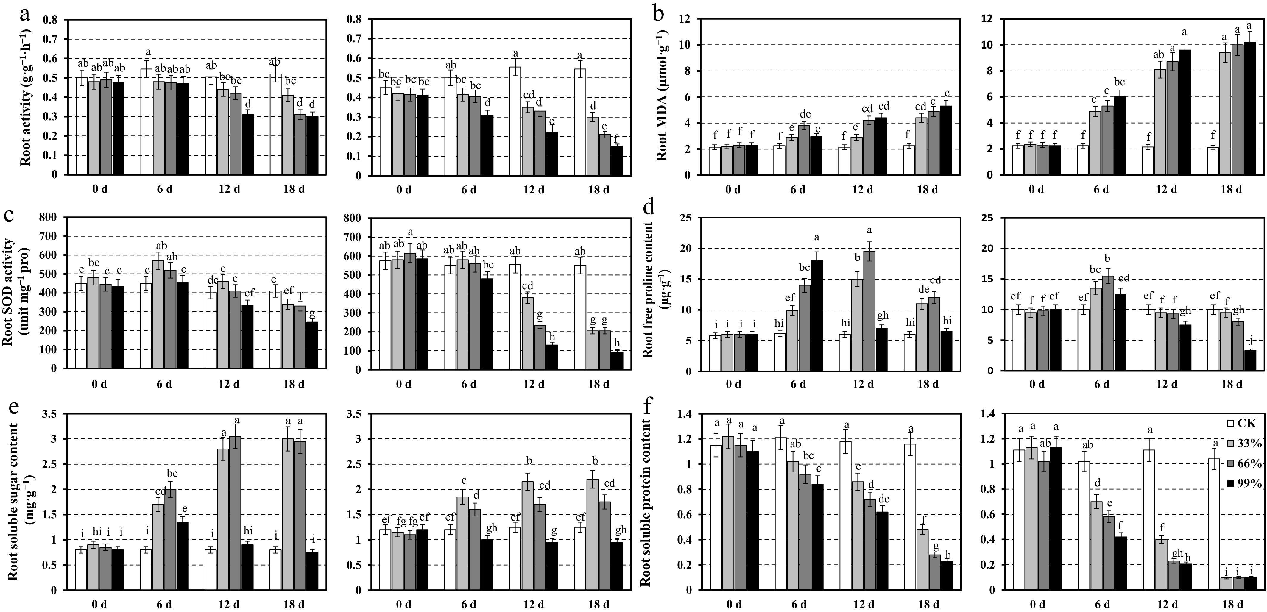Root physiological responses of two centipedegrass genotypes, CP11 (left panels) and CP2 (right panels), under different shading levels (CK [control], 33%, 66%, and 99%) over a time course of 0, 6, 12, and 18 d. Data are shown for (a) root activity (g·g−1·h−1), (b) MDA content (μmol·g−1), (c) SOD activity (unit mg−1 proline), (d) free proline content (μg·g−1), (e) soluble sugar content (mg·g−1), and (f) soluble protein content (mg·g−1). Values represent the means ± SE (n = 3). Different letters indicate statistically significant differences (p < 0.05) according to ANOVA followed by post hoc tests.
