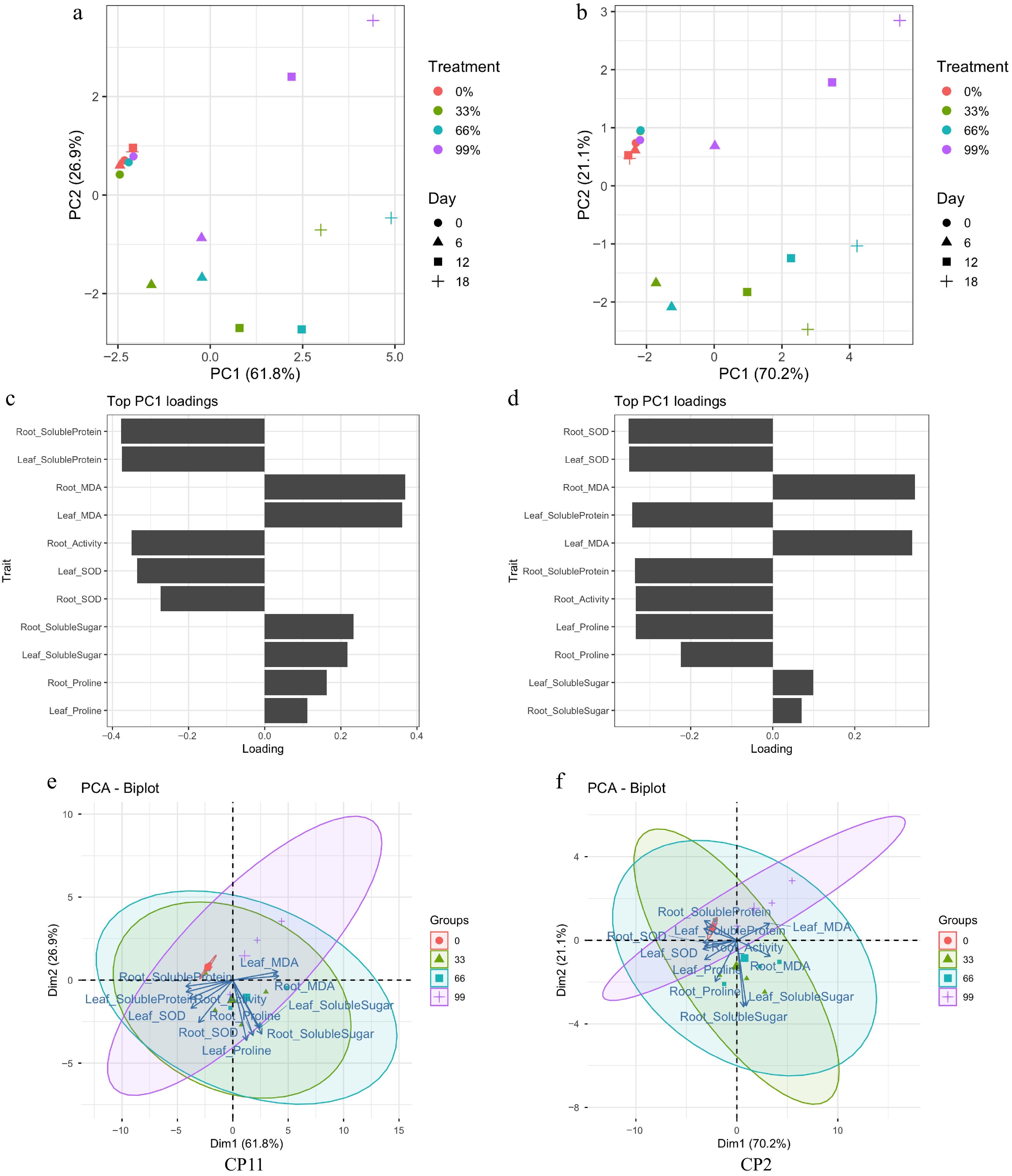 For CP2, PC1 explained 70.2% and PC2 21.1% of the variance (Fig. 5b). Similar to CP11, the treatments were separated along PC1, with stronger separation of shading levels. Traits with the strongest positive loadings on PC1 were root and leaf MDA, whereas root and leaf SOD showed the most negative loadings (Fig. 5d), underscoring the central role of antioxidant capacity and oxidative stress regulation in CP2. In the biplot (Fig. 5f), root and leaf traits appeared more loosely clustered compared with CP11, suggesting less coordinated stress responses across tissues.
