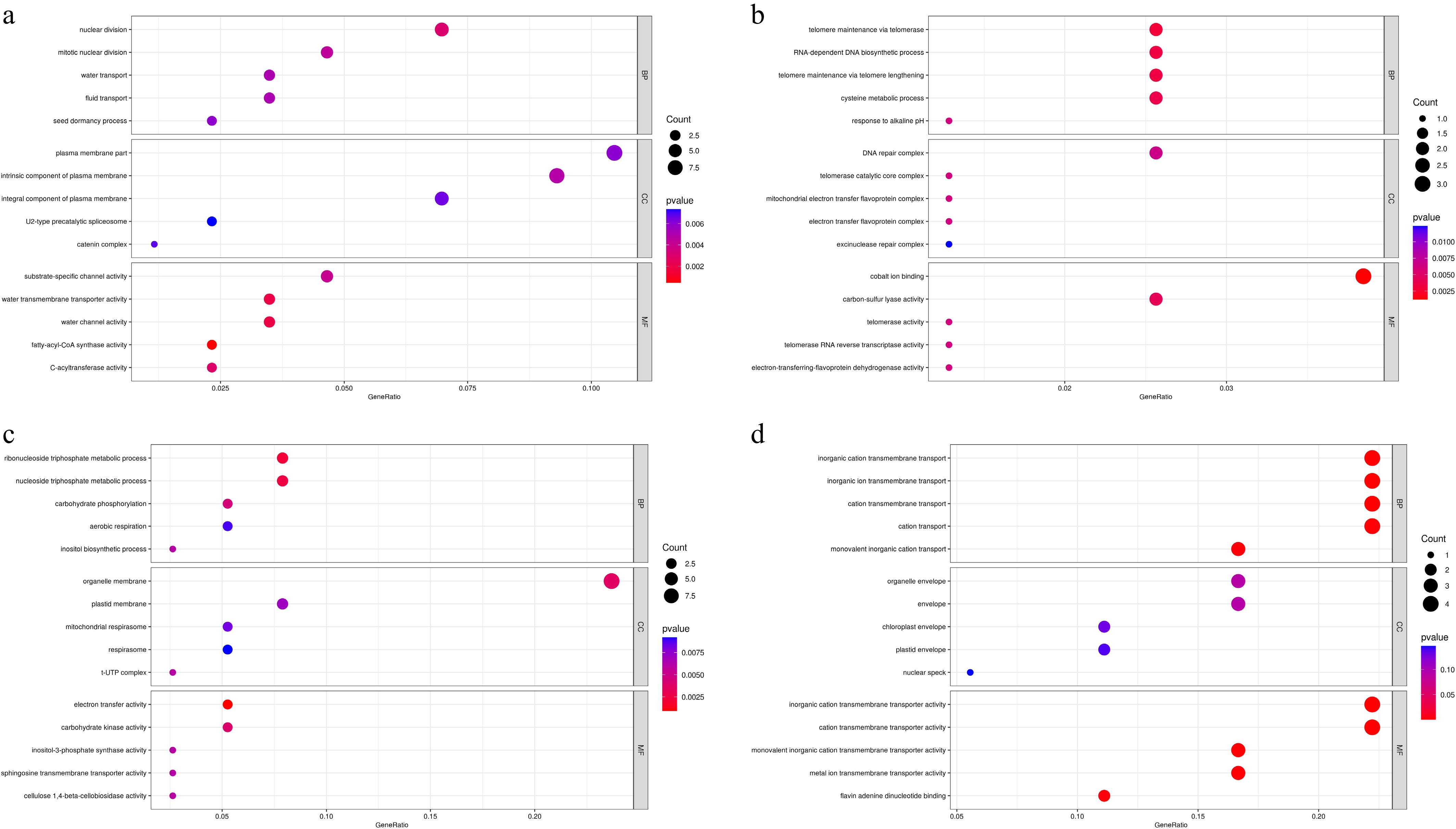 Gene Ontology enrichment analysis of DEGs between CP11 and CP2 genotypes under 99% shading stress. GO analysis was performed for the sets of DEGs identified in Fig. 6cf. (a) Significantly enriched GO terms for upregulated DEGs in the leaves (corresponding to Fig. 6c). (b) Significantly enriched GO terms for downregulated DEGs in the leaves (corresponding to Fig. 6d). (c) Significantly enriched GO terms for upregulated DEGs in the roots (corresponding to Fig. 6e). (d) Significantly enriched GO terms for downregulated DEGs in the roots (corresponding to Fig. 6f). GO terms are categorized as biological process (BP), molecular function (MF), and cellular component (CC) and are shown with their significance levels (e.g., –log10p-value or adjusted p-value).