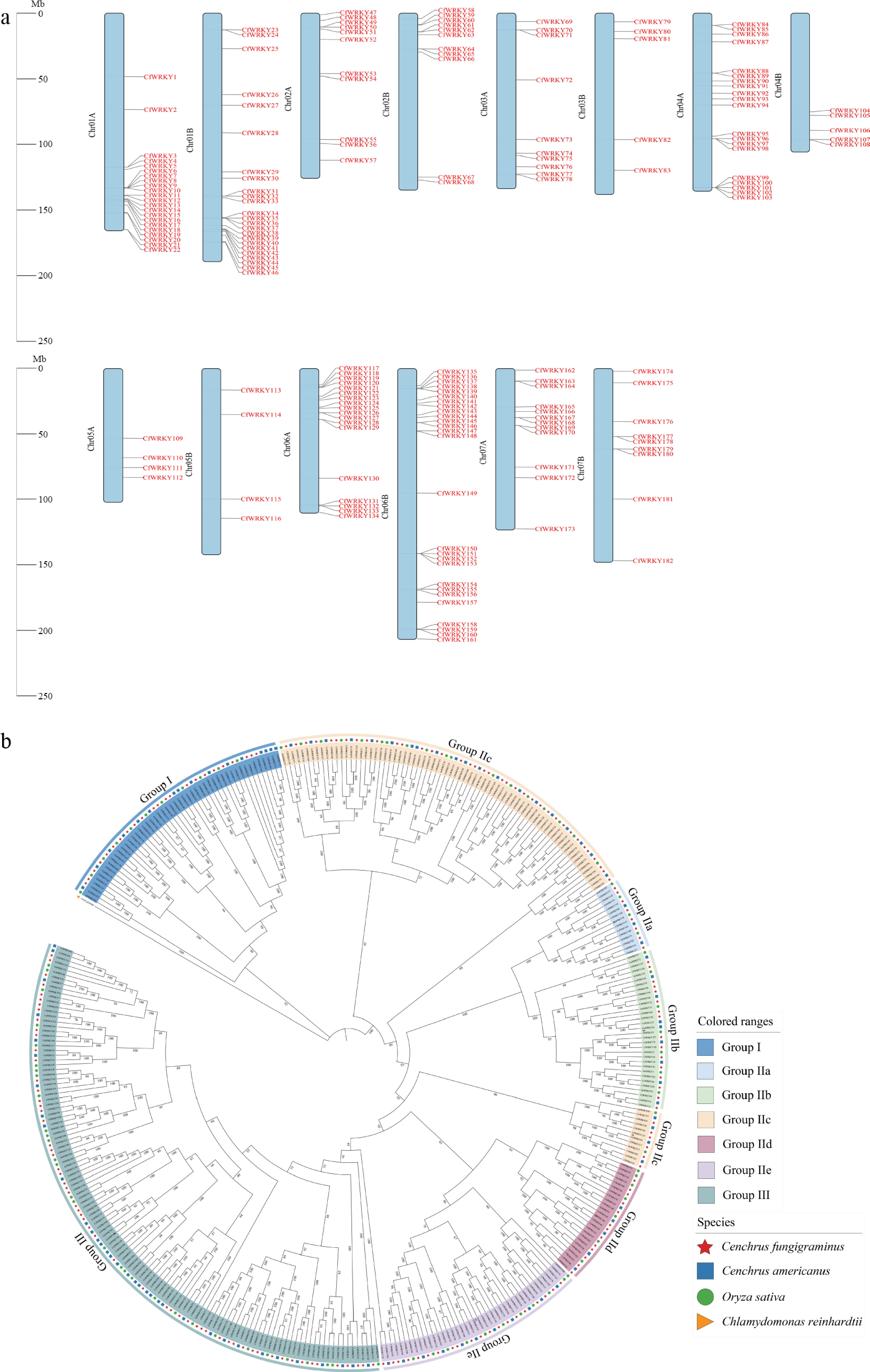 Chromosomal distribution and phylogenetic analysis of CfWRKY genes in Cenchrus fungigraminus. (a) A total of 182 CfWRKY genes were mapped onto the 14 chromosomes (Chr01A–Chr07B) of C. fungigraminus. Chromosomes are shown as colored bars, and gene positions are indicated in red. (b) Phylogenetic analysis of CfWRKY proteins together with WRKY members from C. americanus, O. sativa, and C. reinhardtii (outgroup). CfWRKY genes are marked with red stars, and different groups are indicated by distinct colors.