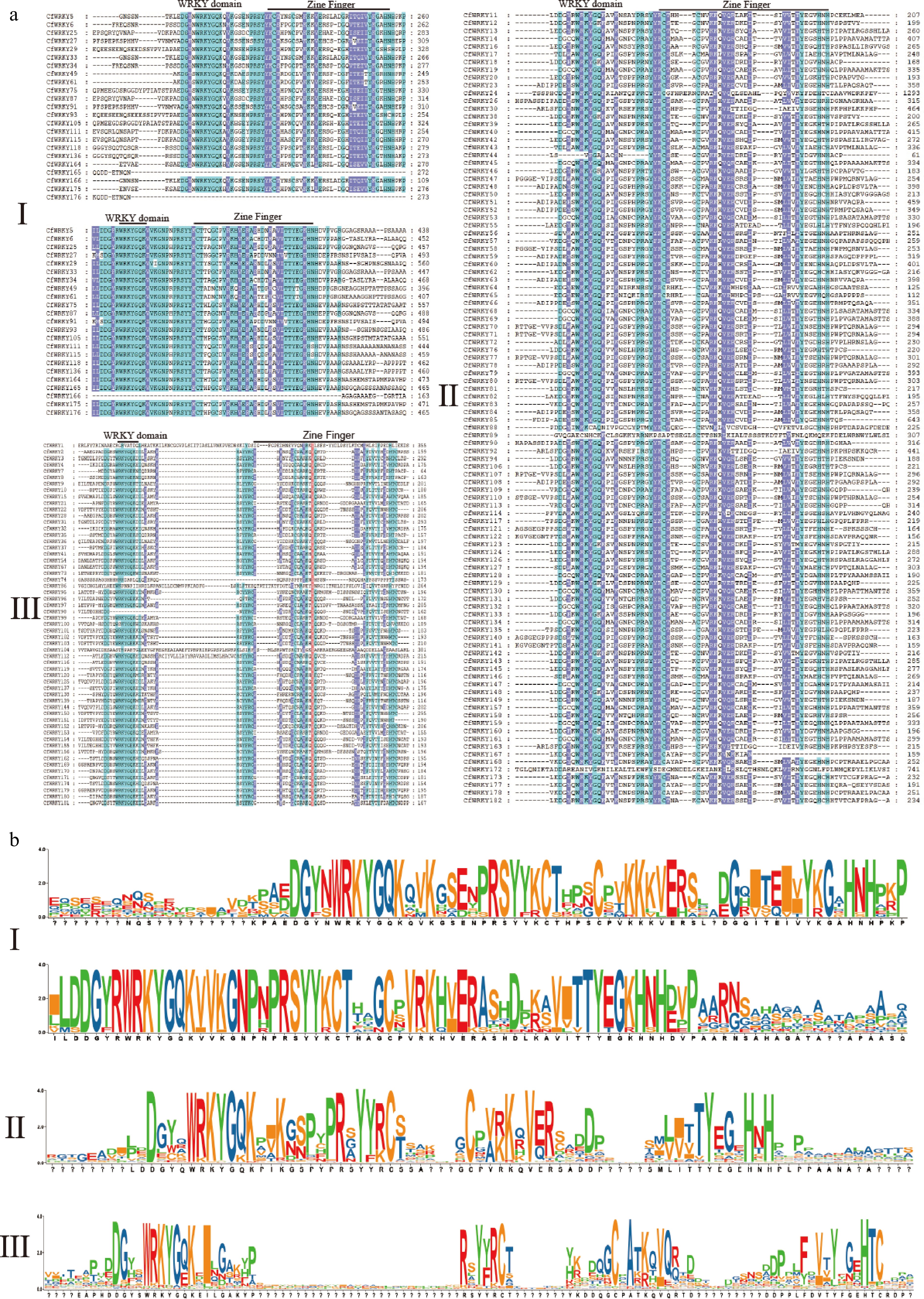 Multiple sequence alignment revealed that most CfWRKY proteins contained the highly conserved WRKYGQK heptapeptide and either C2H2 or C2HC zinc-finger motifs (Fig. 2a). Members of Group I generally possessed two WRKY domains, whereas three proteins exhibited incomplete domains, including CfWRKY165 (lacking the C-terminal domain) and CfWRKY166 and CfWRKY176 (lacking the N-terminal domain). Groups II and III contained a single WRKY domain; however, several members exhibited sequence variations or deletions. In Group II, nine CfWRKY proteins (CfWRKY160, CfWRKY129, CfWRKY38, CfWRKY148, CfWRKY133, CfWRKY18, CfWRKY142, CfWRKY12, and CfWRKY123) showed a Q-to-K substitution (WRKYGKK), while CfWRKY45 displayed a Q-to-R substitution (WRKYGRK). CfWRKY44 exhibited both substitutions and deletions in the heptapeptide, and CfWRKY88 and CfWRKY89 contained multiple mutations that disrupted the integrity of the WRKY domain. In Group III, most members displayed partial deletions of the domain, often resulting in the WRKY--GQ motif, and six members showed extensive deletions or multiple mutations, leading to loss of a complete WRKY domain.