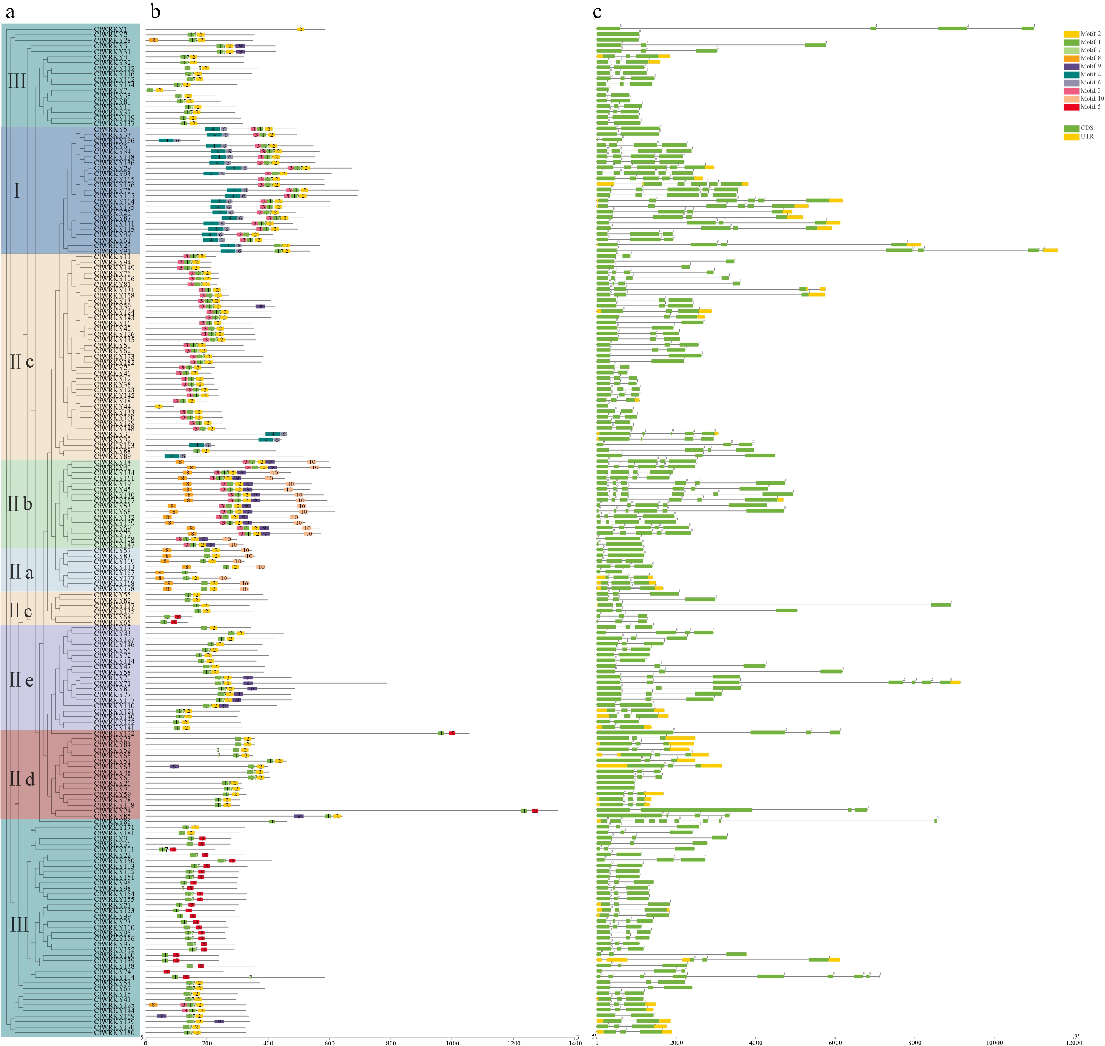 • Ten highly conserved motifs were identified among CfWRKYs (Fig. 3a), with each member containing two to six motifs. Most CfWRKY proteins possessed motif 1 and motif 2, which together form the core WRKY domain. In Group II, all members contained both motifs except CfWRKY30, CfWRKY44, CfWRKY88, CfWRKY92, and CfWRKY163. Members within the same subgroup generally shared similar motif composition and arrangement. For example, most Group III proteins contained either motifs 1-2 or motifs 1-6-9, whereas many Group I proteins harbored six motifs (motifs 1, 2, 3, 4, 5, 7) arranged in a conserved order of 4-7-3-1-2-5. Such subgroup-specific motif patterns may underlie functional diversification of WRKY proteins. Intra-group differences were also observed; for instance, CfWRKY94 and CfWRKY67 in Group II lacked motif 9, whereas CfWRKY34 and CfWRKY73 possessed it, suggesting potential functional divergence even among closely related members.