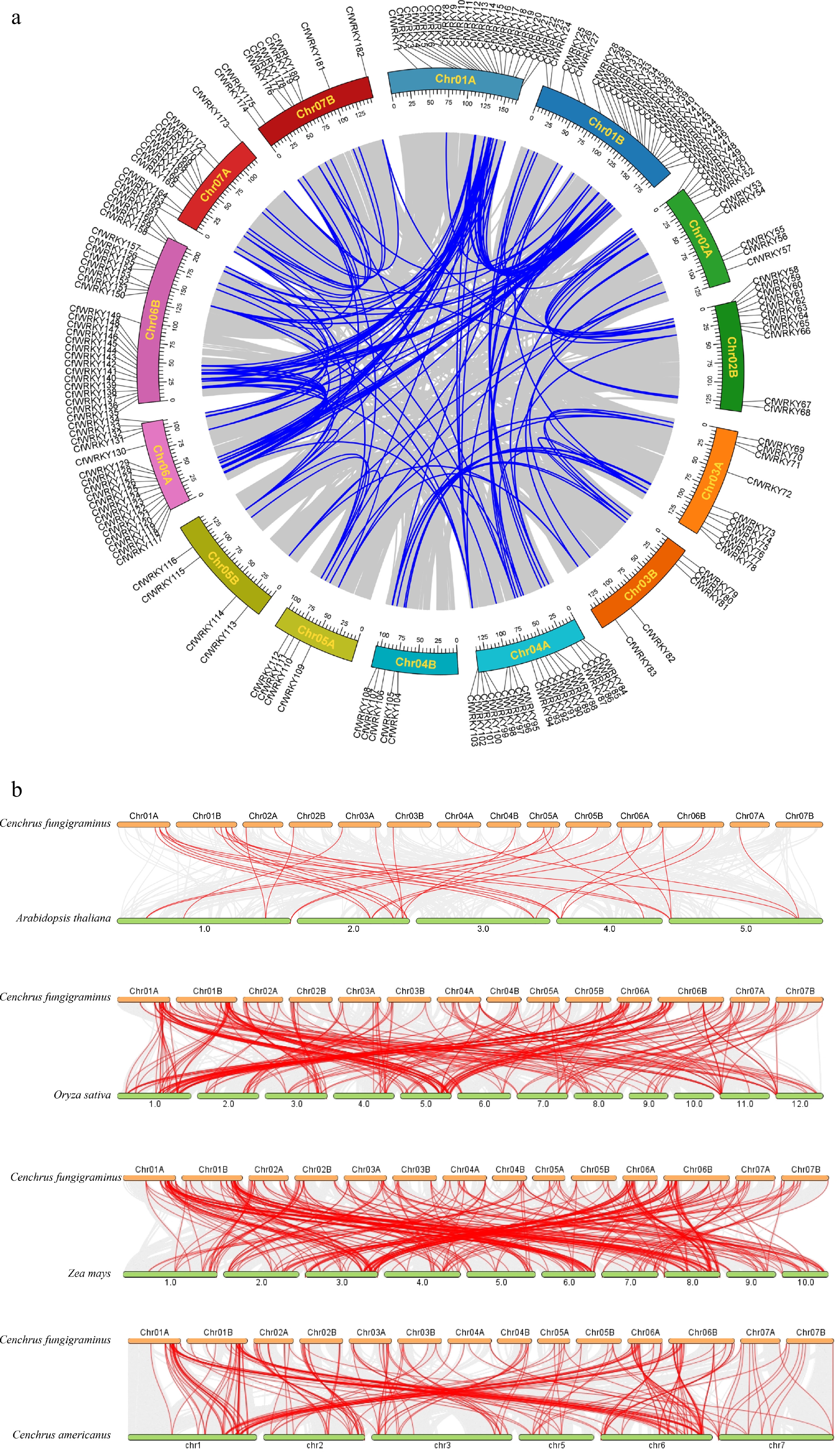 Synteny analysis of the CfWRKY gene family. (a) Intraspecific synteny and chromosomal distribution of CfWRKY genes in C. fungigraminus. The outer track indicates the positions of 182 CfWRKY genes on 14 chromosomes (Chr01A–Chr07B). Blue lines inside the circle represent segmentally duplicated CfWRKY gene pairs. Chromosomes are drawn to scale (Mb). (b) Comparative interspecific synteny of WRKY genes between C. fungigraminus and A. thaliana, O. sativa, Z. mays, and C. americanus, illustrating conserved orthologous gene pairs and their evolutionary relationships.