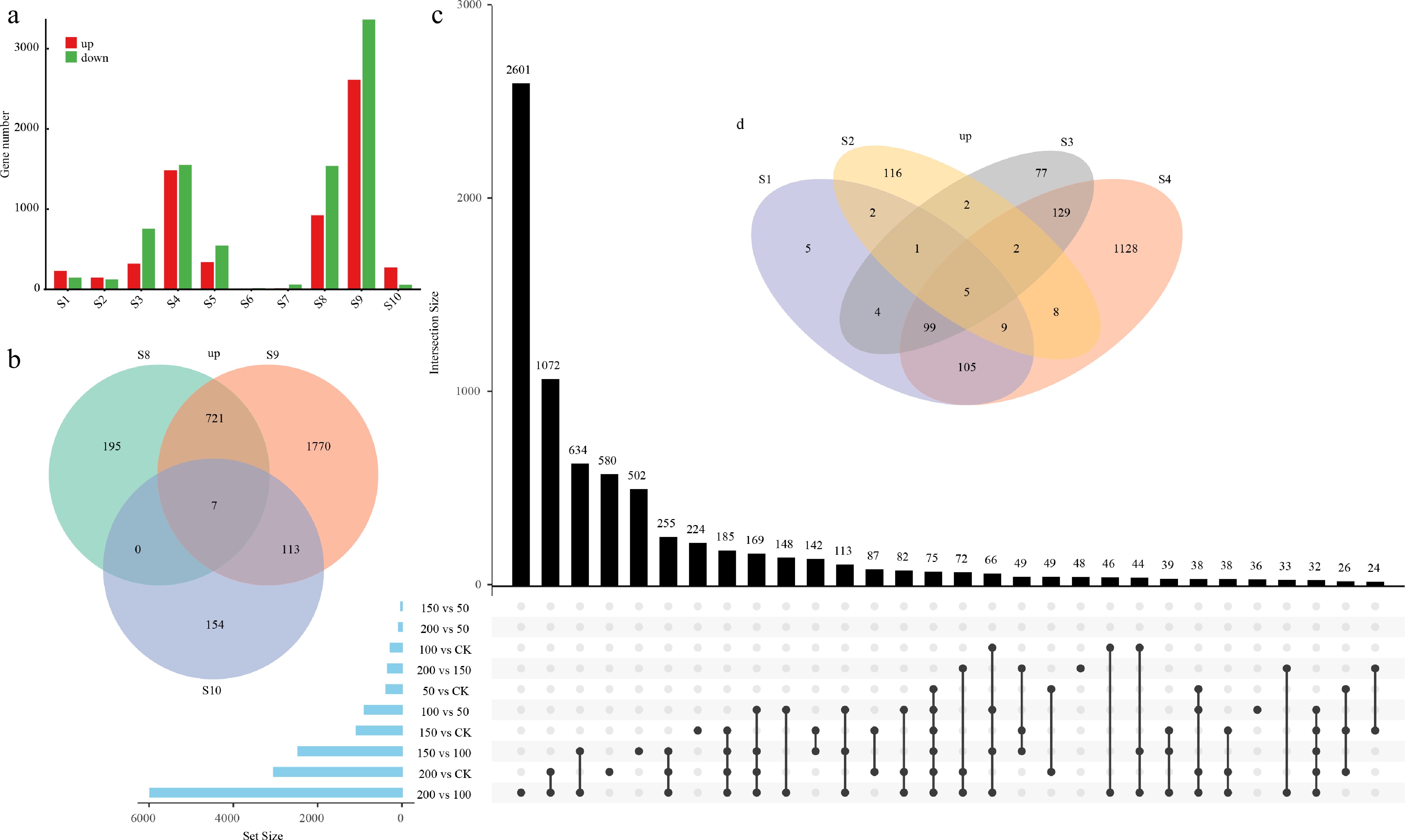 Distribution and overlap of differentially expressed genes (DEGs) under various treatment conditions. (a) Numbers of upregulated and downregulated DEGs identified in each comparison group (S1–S10). The comparison groups are defined as follows: S1, 50 vs CK; S2, 100 vs CK; S3, 150 vs CK; S4, 200 vs CK; S5, 100 vs 50; S6, 150 vs 50; S7, 200 vs 50; S8, 150 vs 100; S9, 200 vs 100; and S10, 200 vs 150. The variation in DEG numbers across comparisons reflects the transcriptional responses under different stress intensities and contrasts. (b) Venn diagram showing the shared and unique upregulated DEGs among S8 (150 vs 100), S9 (200 vs 100), and S10 (200 vs 150). (c) UpSet plot illustrating the intersection patterns and set sizes of DEGs across all comparison groups (S1–S10), revealing both common and distinct transcriptional responses across the stress gradient. (d) Venn diagram showing the overlap of upregulated DEGs among S1 (50 vs CK), S2 (100 vs CK), S3 (150 vs CK), and S4 (200 vs CK), highlighting the core stress-responsive genes under increasing treatment intensities relative to the control.