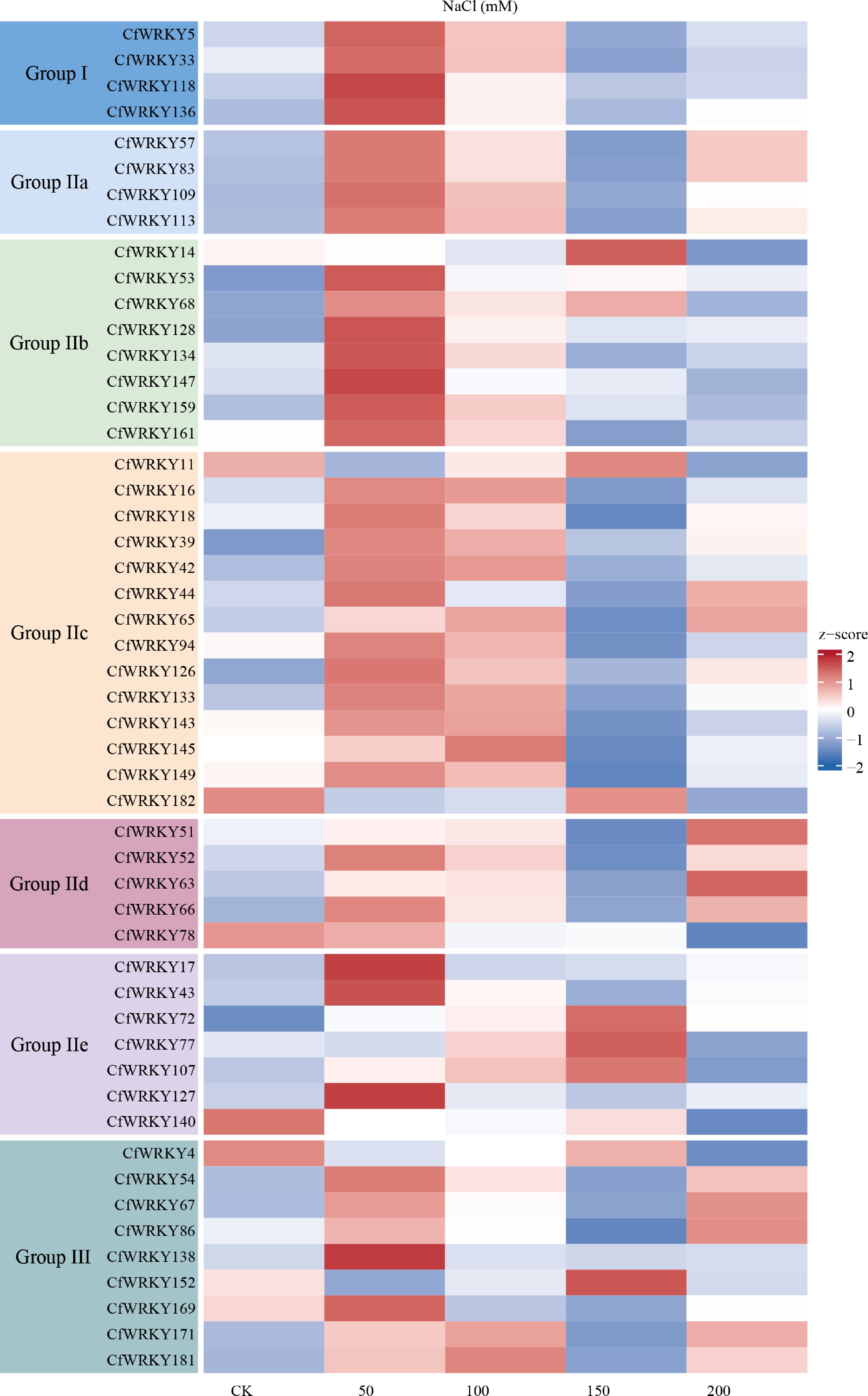Heatmap of WRKY transcription factor (TF) gene expression in C. fungigraminus under salt stress. Gene expression levels were derived from RNA-seq data and transformed as log2(TPM + 1) for visualization. The x-axis shows control (CK) and NaCl treatments at 50, 100, 150, and 200 mM with biological replicates; the y-axis lists all 51 WRKY family members. The color scale represents relative expression from low (blue) to high (red), and genes are organized by phylogenetic group, as indicated by colored blocks on the left.