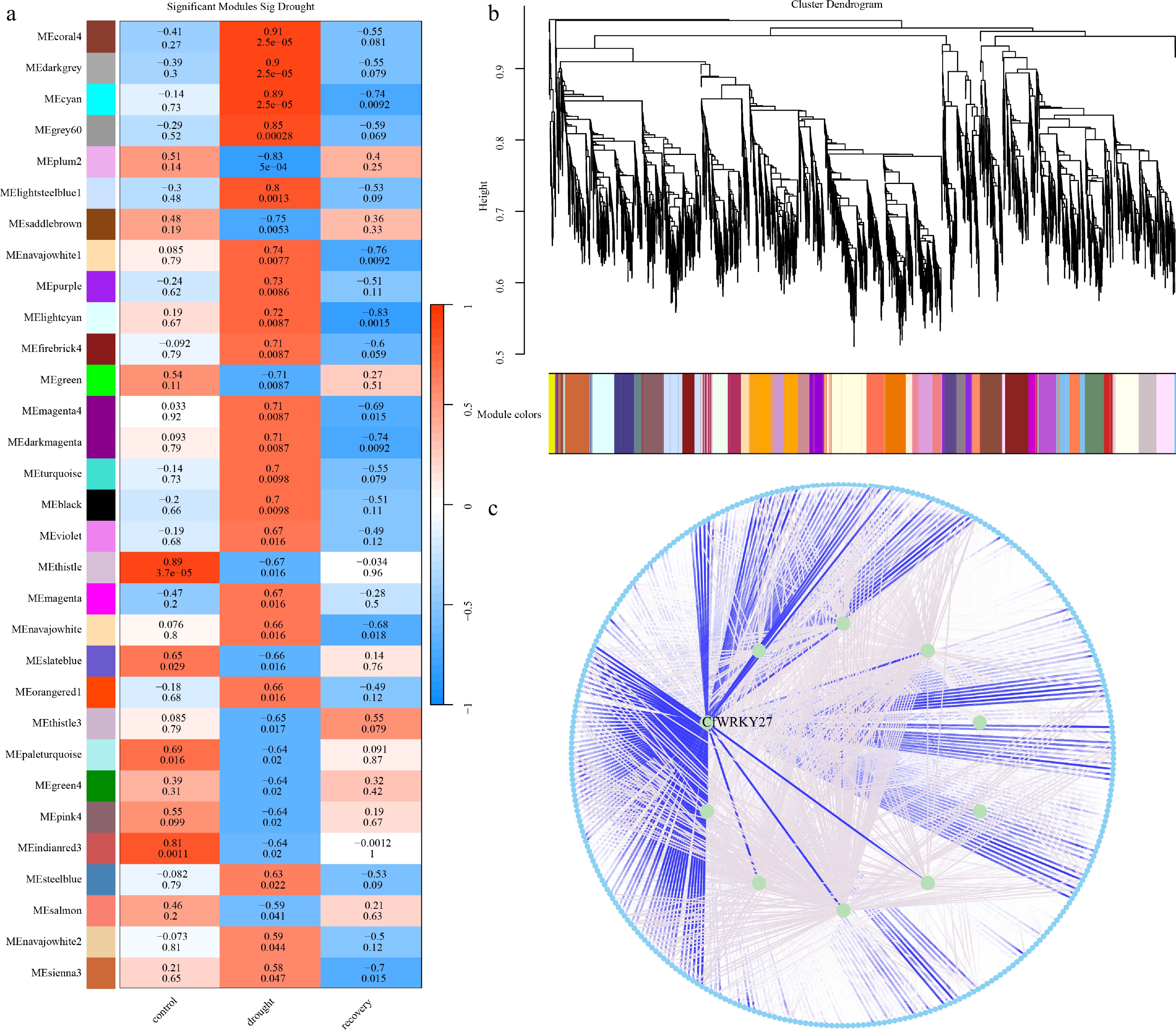 WRKY-associated drought modules and hub network in C. fungigraminus. (a) Module–trait correlations under control, drought, and recovery conditions, showing drought-responsive modules. (b) Gene clustering dendrogram and WGCNA module assignment. (c) Drought-responsive coexpression network highlighting the hub transcription factor CfWRKY27, which displays strong connectivity with stress-related genes.