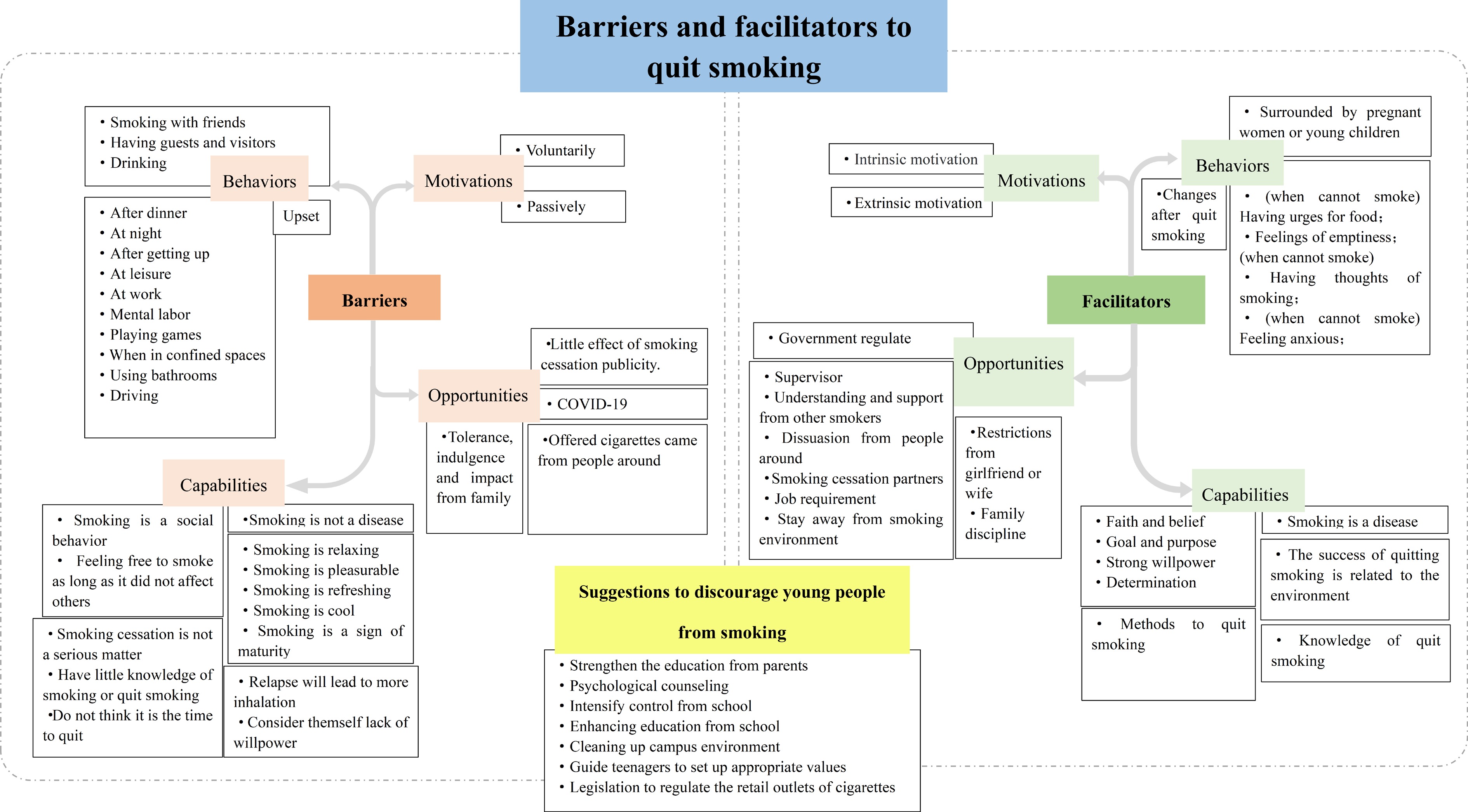 Based on the COM-B model, we employed Framework analysis to synthesize the smoking behaviors associated with barriers and facilitators of smoking cessation. The four pre-established themes encompass capability, opportunity, motivation, and behavior. To further investigate factors influencing smoking cessation implementation in the early stages, this study included adolescent smokers and conducted a separate examination of barriers and facilitators specific to teenage smoking cessation. Behavioral orientations encompassed both continued smoking and smoking cessation. All transcripts were imported into Nvivo12 (Version No. 12.6.0.959) for code generation and theme analysis management.