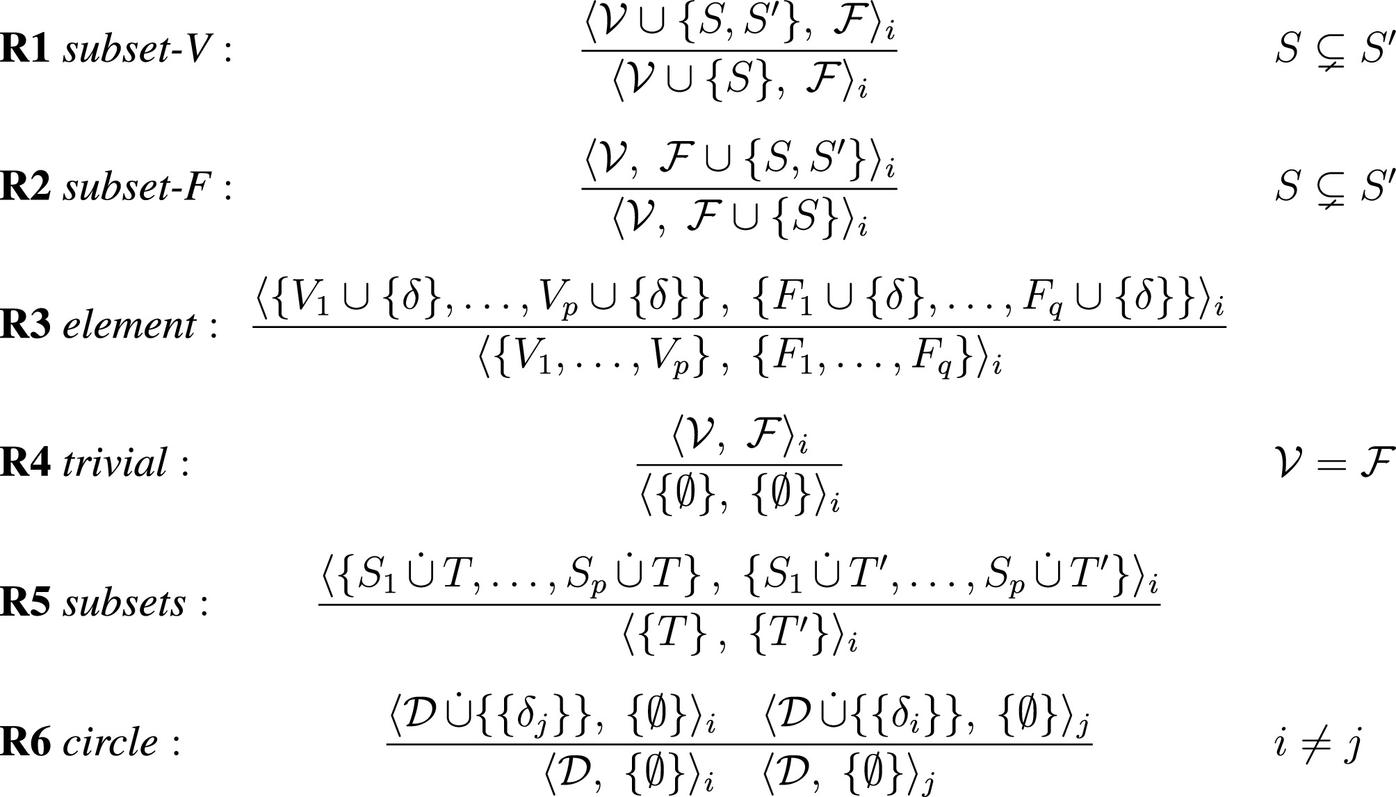 $ \begin{array}{*{20}{c}} \begin{array}{l} V_i = \{\{ \delta' \in \Delta \setminus \{\delta_i\} \mid \omega \in {\mathrm{fal}}(\delta') \} \mid \omega \in {\mathrm{ver}}(\delta_i) \} \\ F_i = \{\{ \delta' \in \Delta \setminus \{\delta_i\} \mid \omega \in {\mathrm{fal}}(\delta') \} \mid \omega \in {\mathrm{fal}}(\delta_i) \} \end{array}&{ , \qquad i \in [n], } \end{array} $