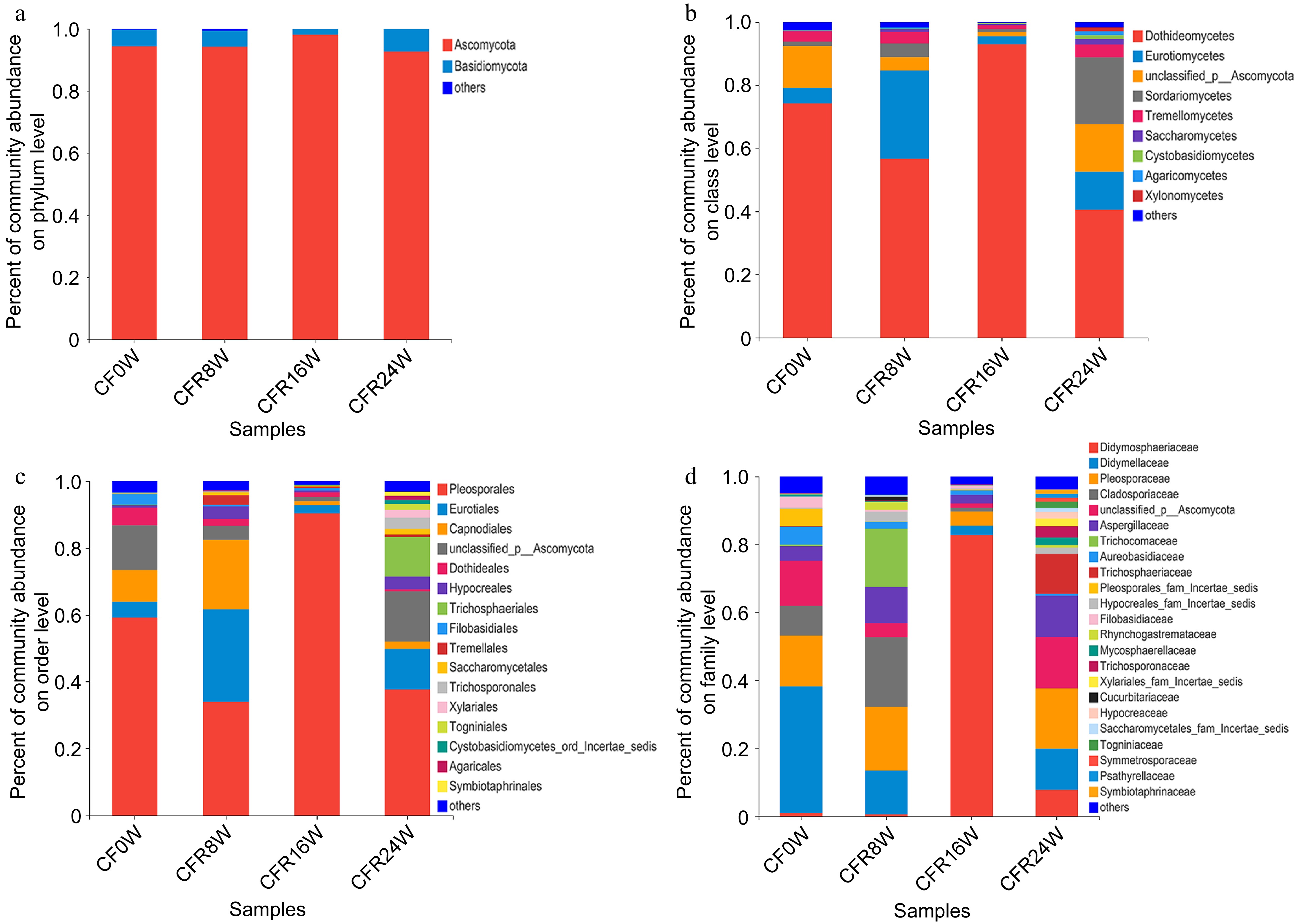 Analysis of fungal community composition of the CFR samples. (a) Phylum level; (b) class level; (c) order level; (d) family level.