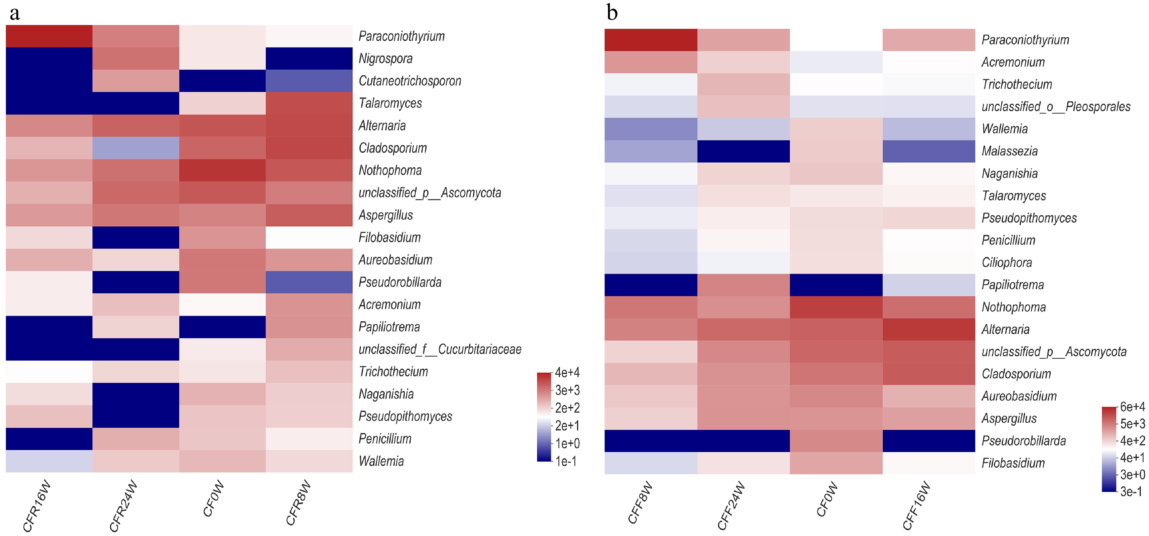 Differences of fungal community at the genus level in (a) the CFR samples and (b) the CFF samples.