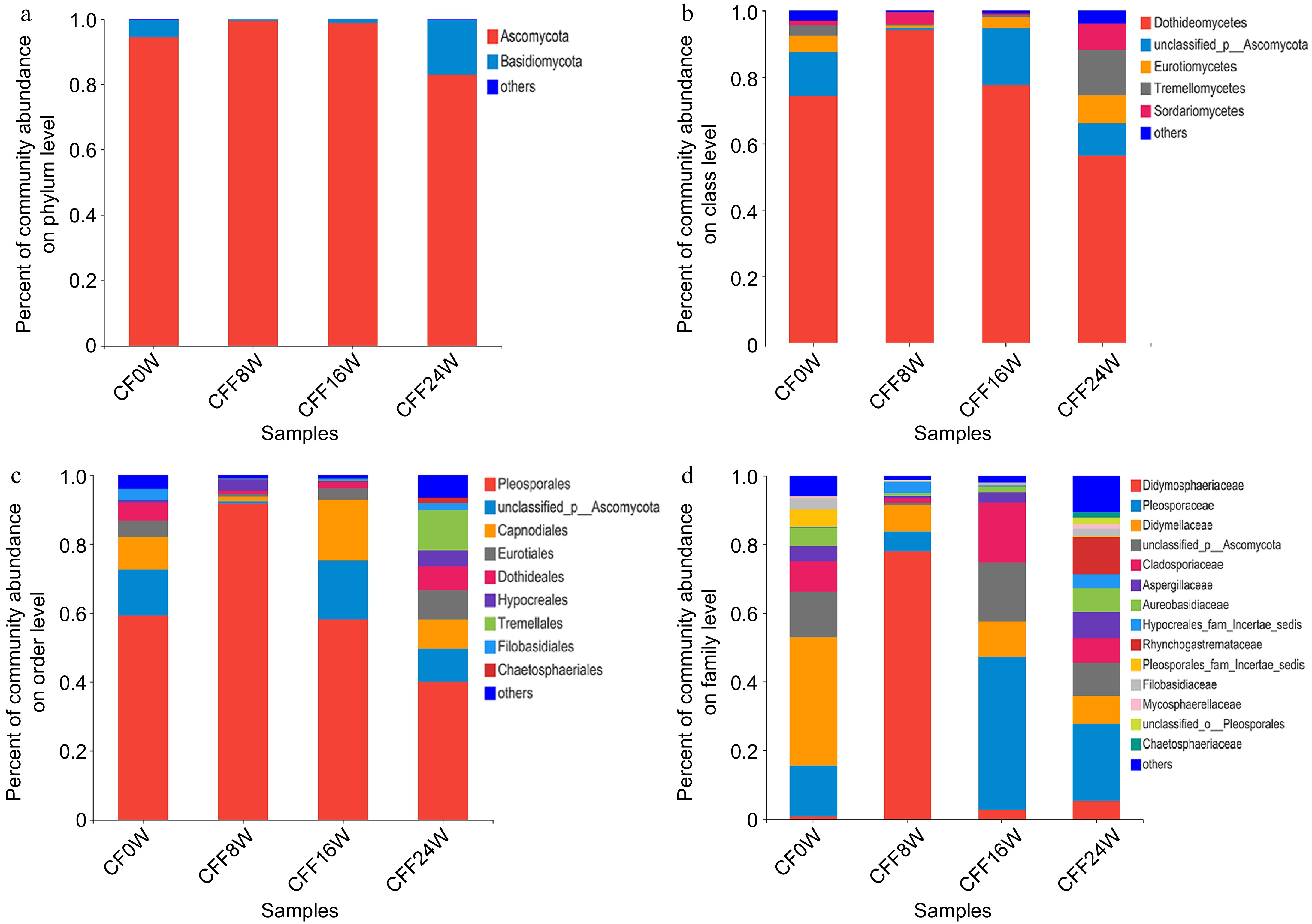 Analysis of fungal community composition in the CFF samples. (a) Phylum level; (b) class level; (c) order level; (d) family level.