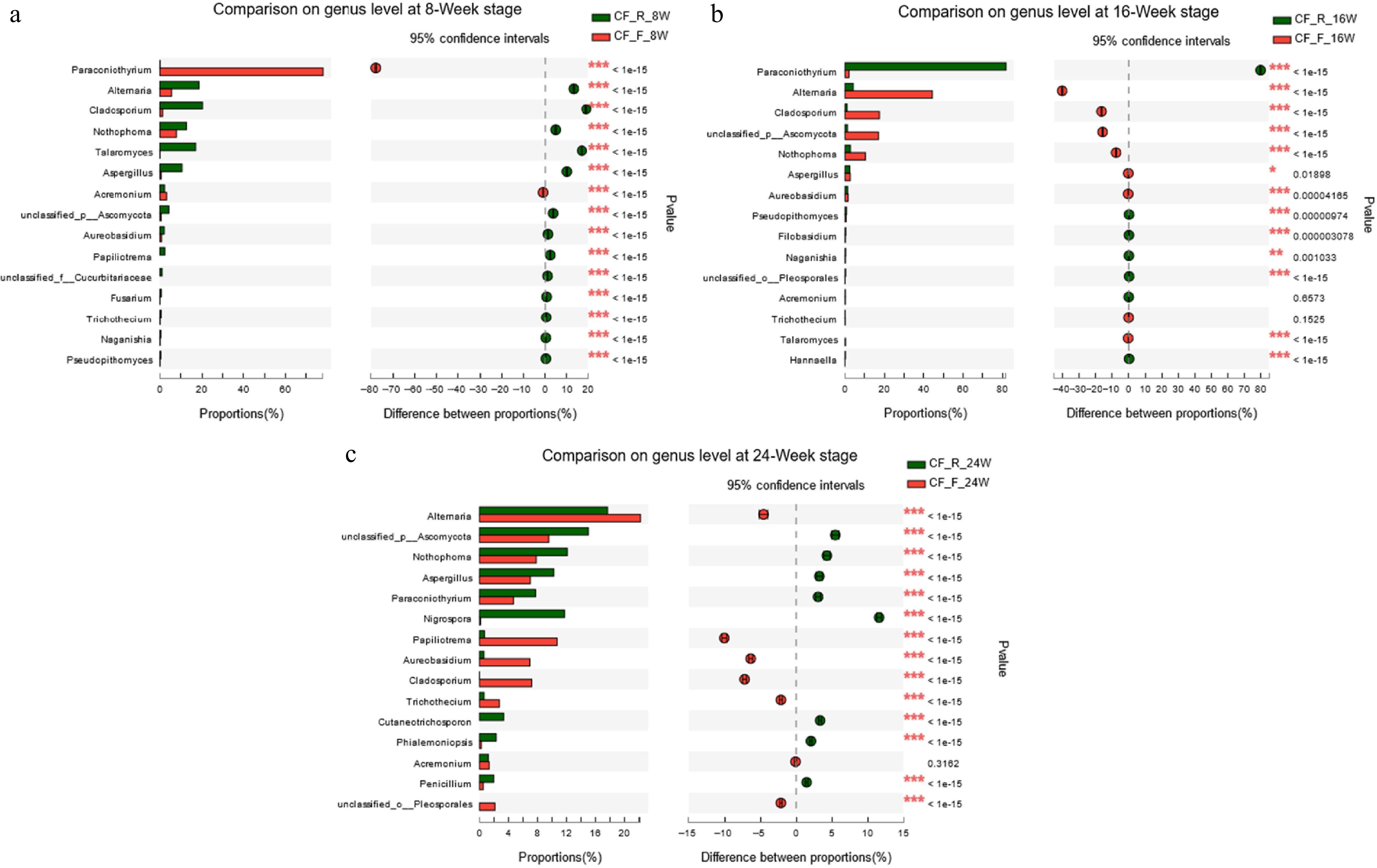• To study the effect of storage temperature on the fungal community in CF, we compared the differences in the fungal community between the samples stored at RT and 4 °C at each time point. At the 8-Week stage (Fig. 6a), the relative abundances of Paraconiothyrium and Acremonium in CFR8W were significantly higher than those in CFF8W, whereas Alternaria, Cladosporium, Nothophoma, Talaromyces, and Aspergillus had higher numbers in CFF8W than in CFR8W. At the 16-Week stage (Fig. 6b), the differences of Paraconiothyrium, Alternaria, Cladosporium, Nothophoma, Aspergillus, Fusarium, and Trichothecium were remarkably distinguishable. At the 24-Week stage (Fig. 6c), compared with those in CFF24W, the relative abundances of Nothophoma, Aspergillus, Paraconiothyrium, Nigrospora, and Penicillium were significantly higher in CFR24W, while Alternaria, Papiliotrema, Aureobasidium, Cladosporium, and Trichothecium had lower relative abundance. At the species level, the relative abundances of seven potentially toxigenic fungi in the CFF samples were higher than those in the CFR samples (Table 3).