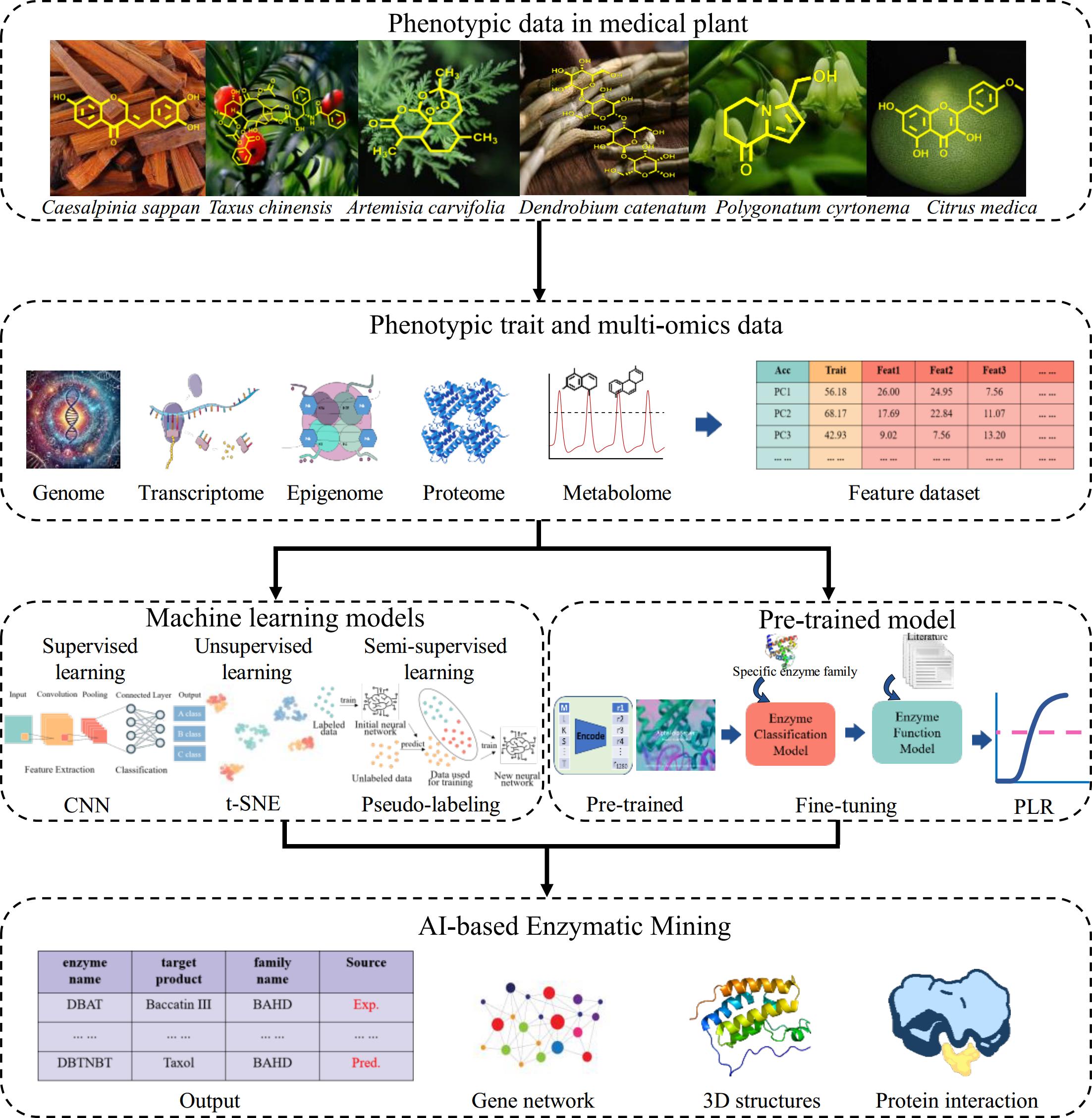 The ultimate goal of medicinal plants is to create high contents of active ingredients. Therefore, it is of paramount importance to elucidate the pathways of these compounds and highly improve biosynthesis efficiency. With the rapid development of high-throughput sequencing, genome-wide association studies (GWAS), and multi-omics approaches, it is now possible to uncover genetic elements[4]. These methods however have rendered the identification of candidate genes low-efficient and unreliable. Currently, Artificial intelligence (AI) in the field of biology has demonstrated significant potential applications to mine candidate genes[5].