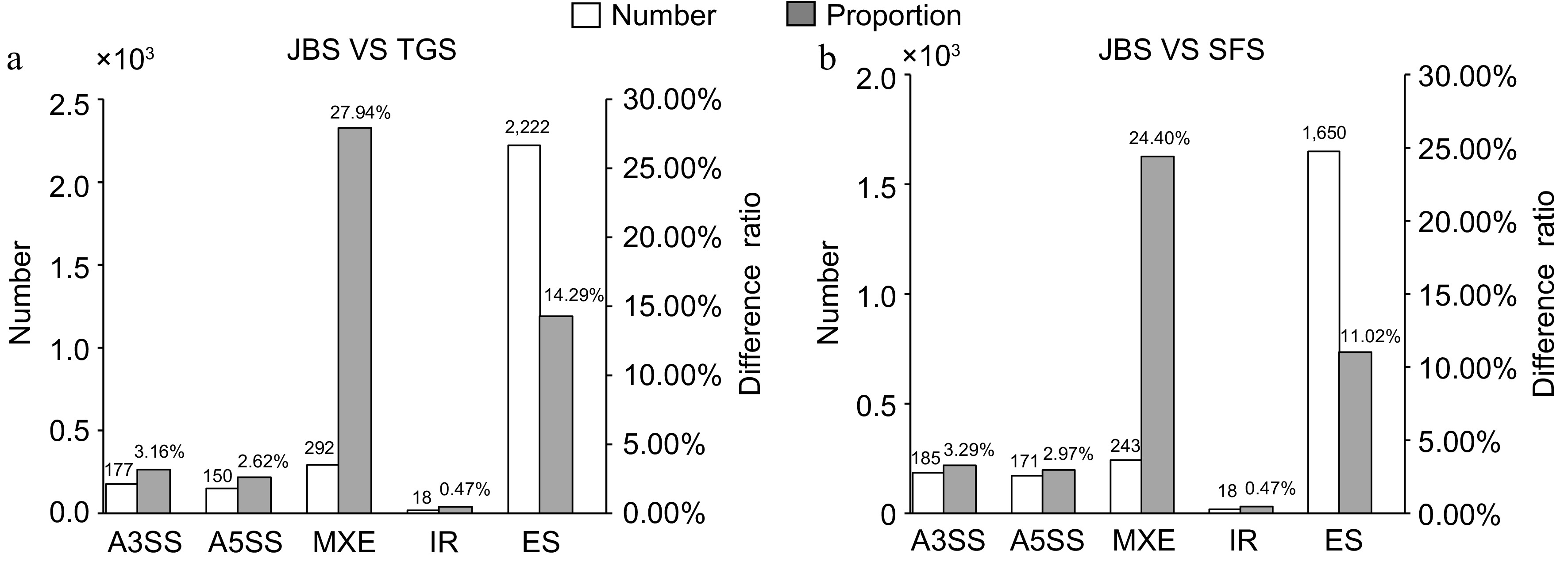 • To gain deeper insights, a comparative analysis of differential AS events was performed between JBS vs TGS and JBS vs SFS, revealing distinct patterns (Fig. 4). In the JBS vs TGS comparison, 177, 150, 292, 18, and 2,222 differential AS events were identified for A3SS, A5SS, MXE, IR, and ES, respectively. In the JBS vs SFS comparison, these numbers were 185, 171, 243, 18, and 1,650 for the same AS types. Notable variations in the discrepancy proportion among the different AS types were observed. MXE exhibited the highest discrepancy proportion, approximately 25%, reaching 27.94% in JBS vs TGS, and 24.40% in JBS vs SFS. ES displayed the second-highest discrepancy proportion, ranging from 10%–15%, with values of 14.29% in JBS vs TGS, and 11.40% in JBS vs SFS. A3SS and A5SS showed a more moderate discrepancy proportion, around 3.50% and 2.90%, respectively; A3SS reached 3.16% in JBS vs TGS, and 3.29% in JBS vs SFS, while A5SS peaked at 2.62% in JBS vs TGS, and 2.92% in JBS vs SFS. IR presented the lowest discrepancy proportion, around 0.47% in both comparisons. Based on these results, ES and MXE were selected for further analysis due to their higher frequency of AS events and greater discrepancy proportion, with MXE showing the largest difference proportion among all AS types.