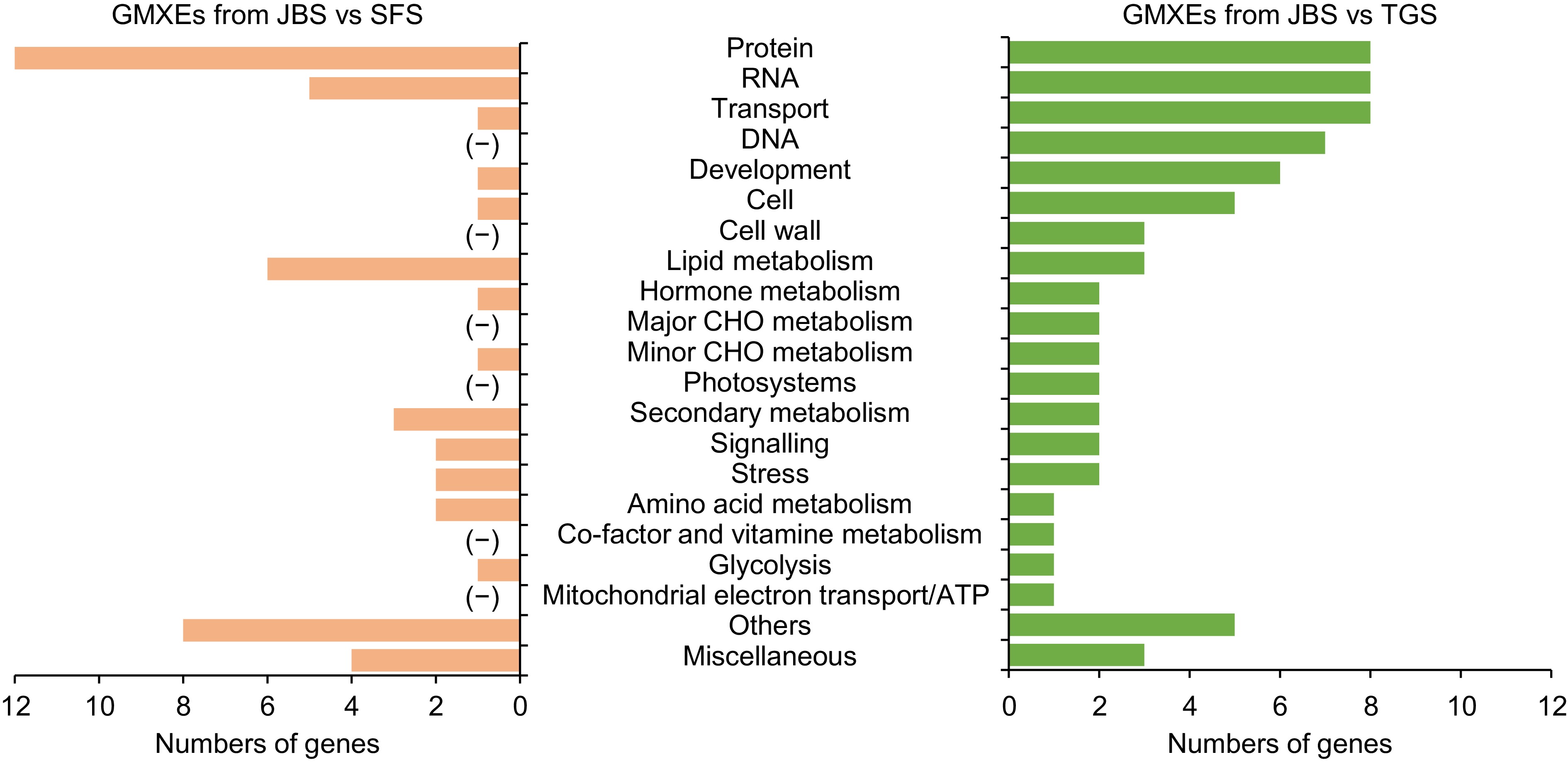 The function of genes involved in mutually exclusive exon events. Gene functions were predicted and categorized using MapMan bin codes. '(−)' indicates that no gene was categorized. Abbreviations: CHO, carbohydrate.