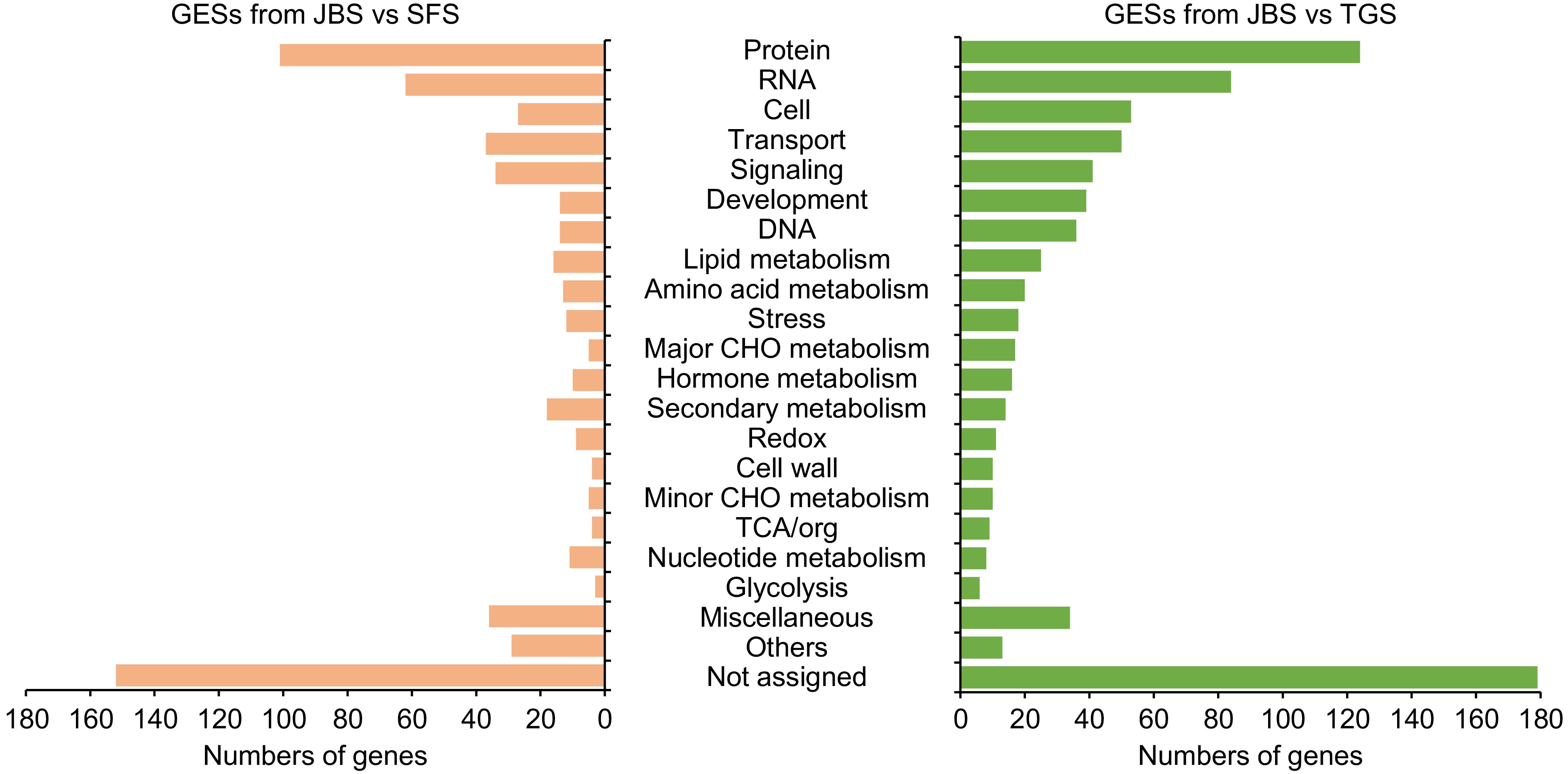 • To investigate the impact of ES events on physiological metabolism, genes modified by ES events (GES) were functionally categorized. GESs identified in TGS and SFS were primarily enriched in protein metabolism, RNA metabolism, cell metabolism, transport, and signaling pathways. Additionally, the number of GESs associated with development, DNA metabolism, lipid metabolism, amino acid metabolism, and major carbohydrate metabolism were significantly lower in SFS compared to TGS. Secondary metabolism played a notable role, with 14 genes associated with secondary metabolic functions in the JBS vs TGS comparison, and 18 genes in the JBS vs SFS comparison (Fig. 6). The gene annotations were submitted to the KEGG database for enzyme identification. Four key enzymes closely related to secondary metabolism were identified: tyrosine decarboxylase (TYDC), chalcone isomerase (CHI), strictosidine synthase (STR), and 2'-hydroxyisoflavone reductase (IFR). Interestingly, TYDC and CHI were found in the TGS group but not in the SFS group, suggesting that ES events may occur specifically in TGS, involving metabolic pathways related to aromatic amino acid metabolism, isoquinoline alkaloid biosynthesis, and flavonoid biosynthesis. Conversely, STR and IFR were present in the SFS group but absent in the TGS group, indicating that ES events likely occur only in SFS, affecting metabolic pathways associated with indole alkaloid biosynthesis and isoflavonoid biosynthesis.