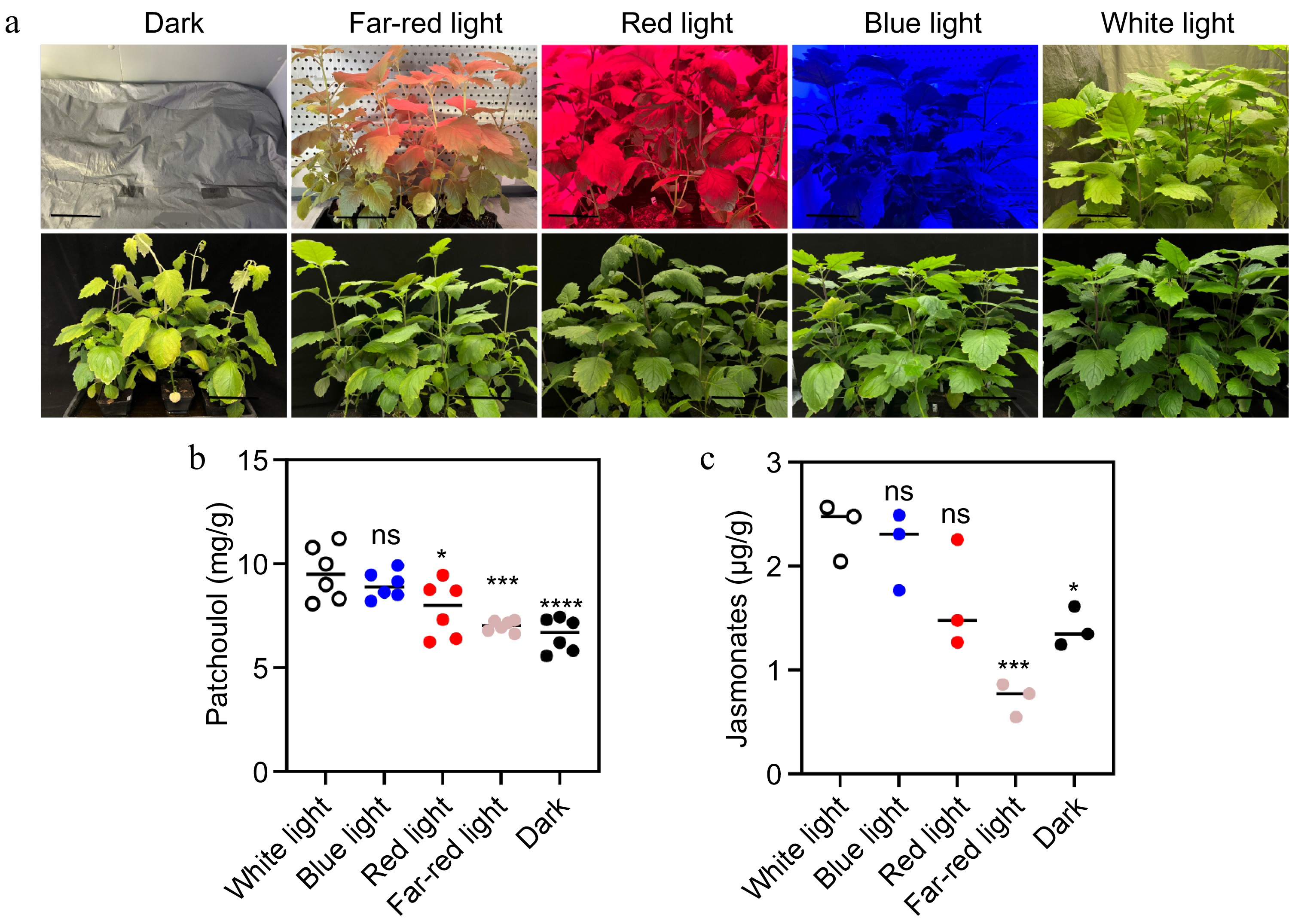 Effect of light on patchoulol and JA accumulation. (a) Photographs of patchouli plants under different light conditions: dark, far-red light, red light, blue light, and white light. The top row shows the plants after two weeks of treatment. (b) Patchoulol accumulation across different light treatments. (c) JA levels under the same conditions. Black line length: 10 cm. * p < 0.05; ** p < 0.01; *** p < 0.001; ns, not significant. Student's t-test.
