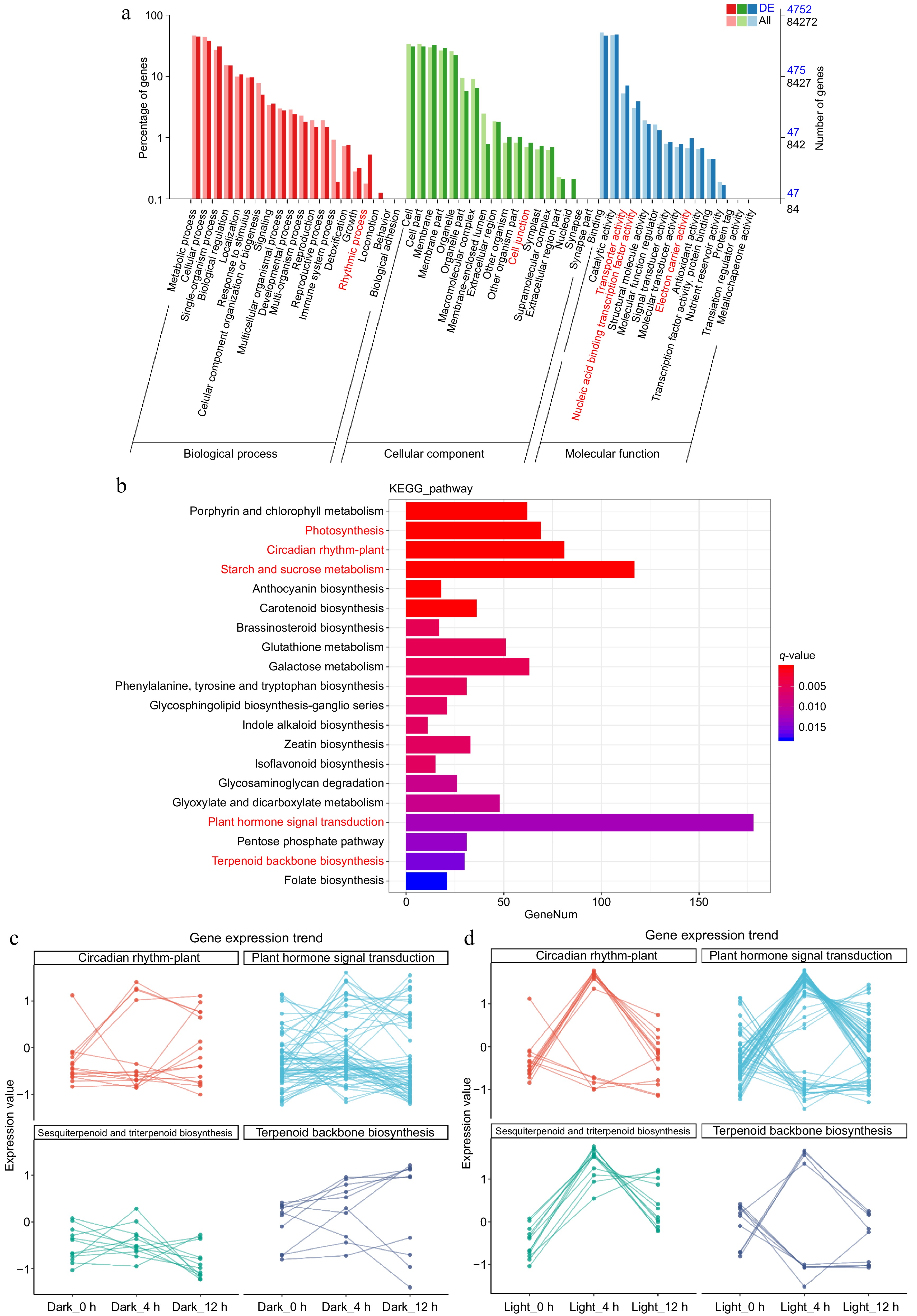 Gene expression profile and function enrichment statistics of patchouli under dark and light conditions. (a) The bar chart displays the percentage of genes associated with various Gene Ontology (GO) terms across three categories: biological process (red), cellular component (green), and molecular function (blue). Notably, second-level function terms that are significantly enriched are highlighted in red. (b) The histogram presents the results of KEGG pathway analysis, showing the number of genes involved in various metabolic pathways. Key pathways, such as 'Photosynthesis' and 'Circadian rhythm—plant', are marked in red, indicating their significant enrichment. (c) The line graphs depict the gene expression trends for selected pathways, including 'Plant hormone signal transduction', 'Circadian rhythm—plant', 'Sesquiterpenoid and triterpenoid biosynthesis', and 'Terpenoid backbone biosynthesis'. The expression values are plotted across different time points under dark and light conditions, illustrating the dynamic changes in gene expression in response to light exposure.