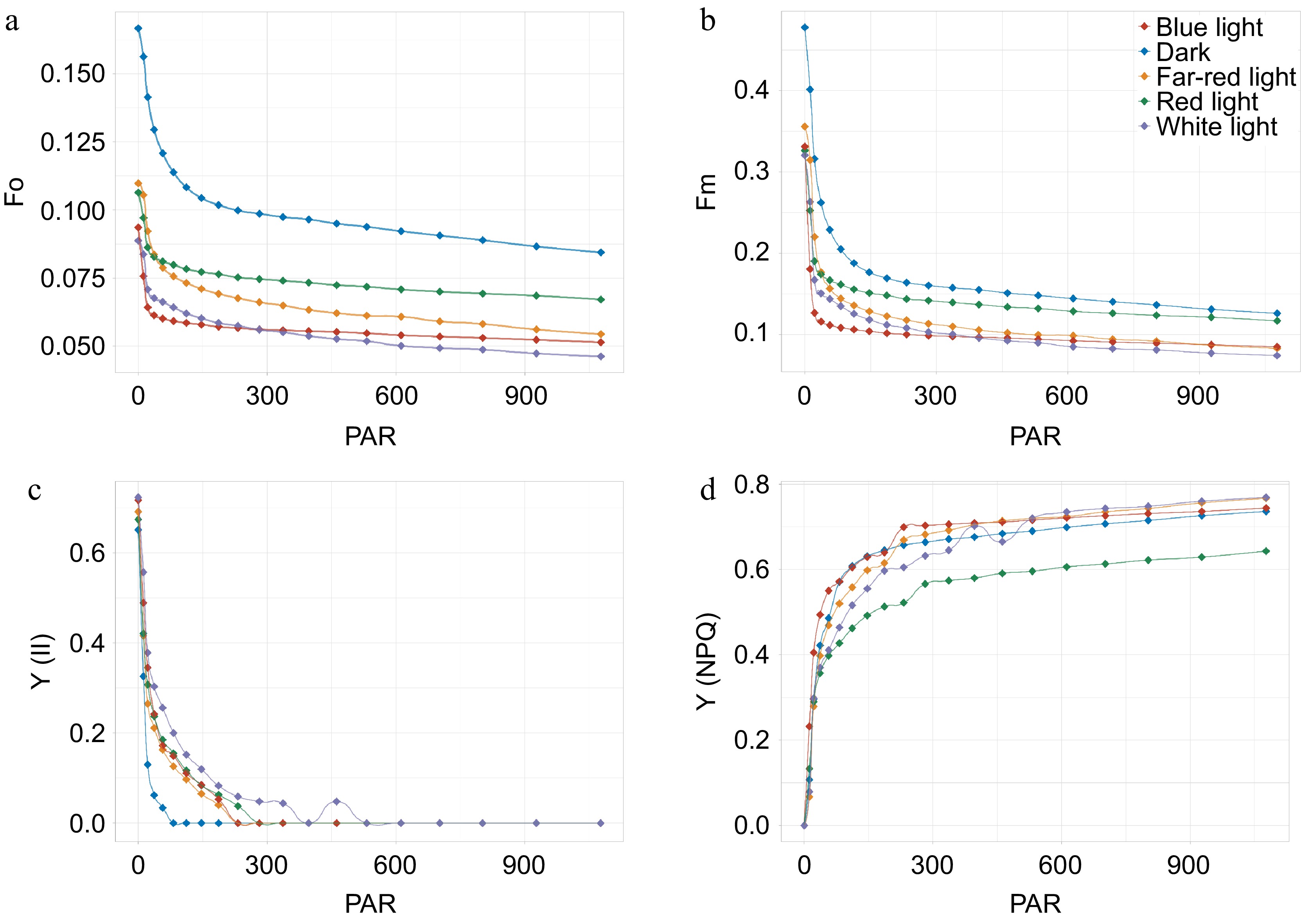 Photosynthetic performance of patchouli plant in different light conditions. (a)−(d) Illustrate the light response curves for different photosynthetic parameters. F0, minimal fluorescence in the dark adaptation state; Fm, the maximum quantum yield of PS II photochemistry measured in the dark adaptation state; Y(II), PS II actual photosynthetic efficiency, effective quantum yield of photochemical energy conversion in PS II; Y(NPQ), Quantum yield of regulated non-photochemical quenching. X-axis refer to photosynthetically active radiation (PAR).