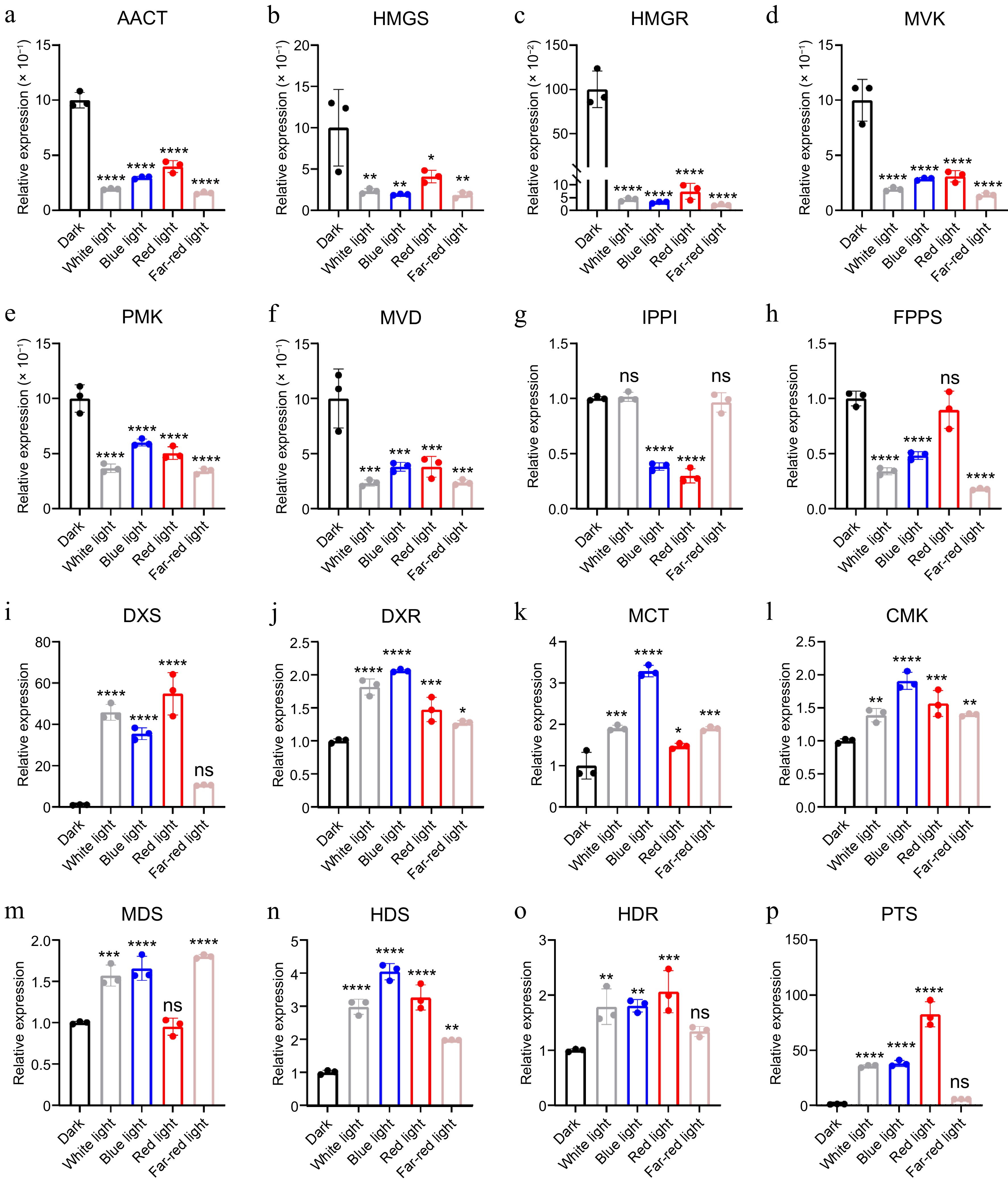 • Mevalonate (MVA) and methylerythritol phosphate (MEP) are main pathways of terpenoid backbone biosynthesis. The expression of key enzyme genes involved in MVA and MEP pathways, as well as patchoulol biosynthesis, was assessed in patchouli under varying light conditions. The results demonstrated no effect or repression of light on the expressions of acetoacetyl-CoA thiolase (AACT), 3-hydroxy-3-methylglutaryl-CoA synthase (HMGS), 3-hydroxy-3-methylglutaryl-CoA reductase (HMGR), mevalonate kinase (MVK), phosphomevalonate kinase (PMK), mevalonate diphosphate decarboxylase (MVD), isopentenyl diphosphate isomerase (IPPI) and farnesyl diphosphate synthase (FPPS); while under the same conditions, it was activated when it came to 1-Deoxy-D-xylulose-5-phosphate synthase (DXS), 1-deoxy-D-xylulose-5-phosphate reductoisomerase (DXR), 2-C-methyl-D-erythritol 4-phosphate cytidylyltransferase (MCT), 4-(cytidine 5'-diphospho)-2-C-methyl-D-erythritol kinase (CMK), 2-C-methyl-D-erythritol 2,4-cyclodiphosphate synthase (MDS), 1-hydroxy-2-methyl-2-(E)-butenyl 4-diphosphate synthase (HDS), 1-hydroxy-2-methyl-2-(E)-butenyl 4-diphosphate reductase (HDR) and patchoulol synthase (PTS) (Fig. 4). For enzymes in the MEP pathway, it might be interpreted that plastid is the compartment which these enzymes work (Fig. 4). Notably, light exposure exerted divergent regulatory effects on the two terpenoid precursor pathways: the cytosolic MVA pathway genes remained either unaffected or showed mild suppression (Fig. 4), whereas their plastid-localized MEP pathway counterparts, particularly DXS and PTS, exhibited potent activation under white light. Consistent with the transcriptional activation PTS in the MEP pathway (Fig. 4), GC-MS analysis revealed a higher patchoulol level under white light (Fig. 1b), demonstrating the close link between gene expression and metabolism. The biosynthesis of patchoulol is catalyzed by PTS, and the MVA and MEP pathways may exert effects via redox-mediated regulation and metabolic flux compensation.