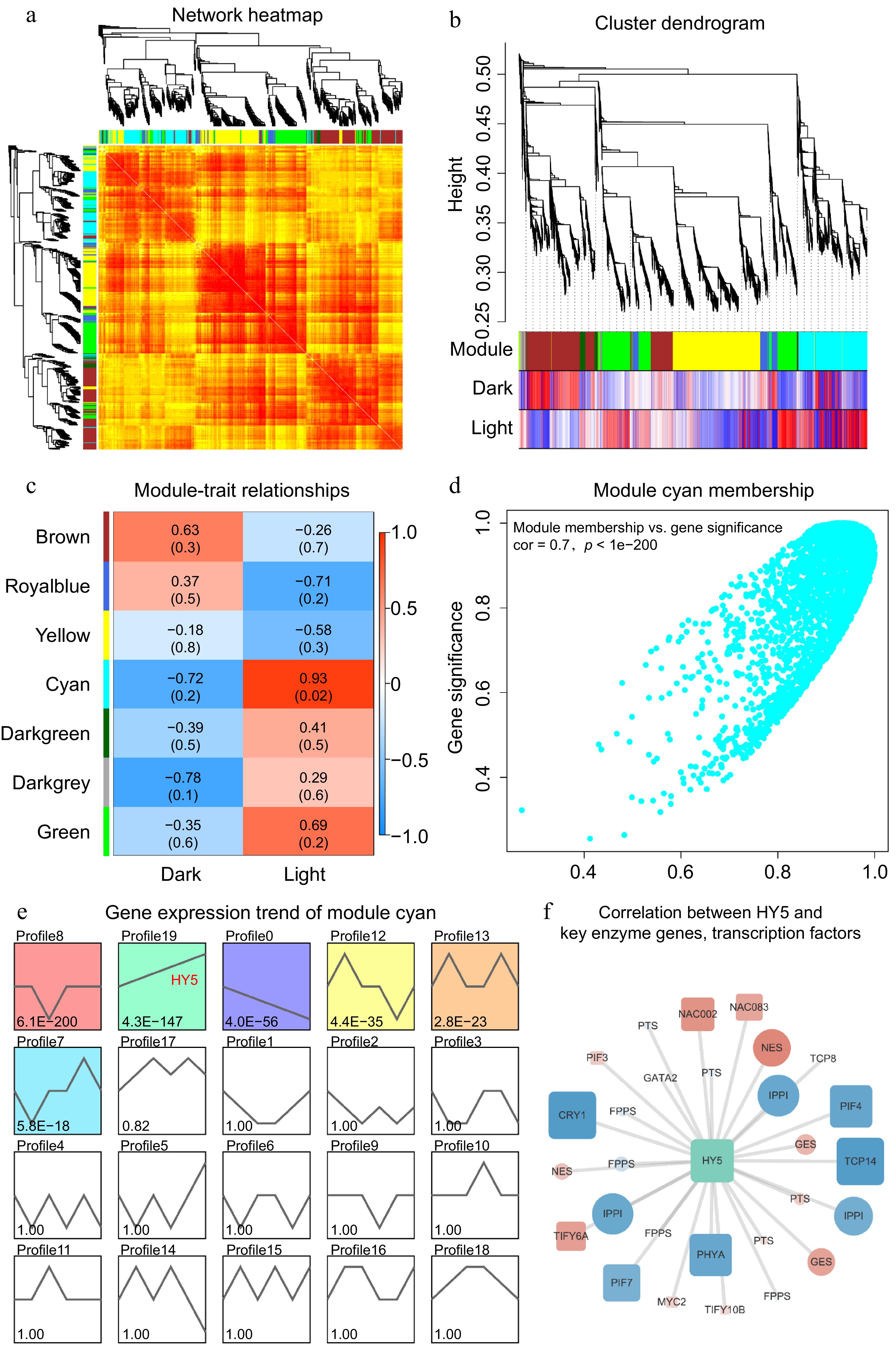 (a) The network heatmap illustrates the gene expression profiles of samples from darkness and light groups; not all genes are displayed. Darker red shades indicate smaller dissimilarities between genes. Symmetrical phylogenetic clustering trees are shown on the left and top sides. (b) The clustering dendrogram provides a visual representation of the hierarchical clustering of genes, with a minimum height value of 0.25 and a minimum module size of 30. This dendrogram further emphasizes the separation of genes into dark and light groups. (c) The module-trait plot demonstrates the correlations between different gene modules and traits. The intensity of the colors indicates the strength of the correlation, with darker red representing stronger positive correlations and darker blue indicating stronger negative correlations. (d) The scatter plot reveals the relationship between module membership and gene significance for the cyan module. A higher correlation coefficient and smaller P value indicate that the module's gene members are more representative of the module's characteristics. (e) The gene expression trends of module cyan members are displayed, depicting various expression profiles. The smaller the P value in these profiles, the more reliable the trends are. Notably, the profile associated with HY5 is highlighted. (f) The correlation network illustrates the relationships between HY5 and key enzyme genes as well as transcription factors. Positive correlations are marked in red, while negative correlations are marked in blue. The size of the nodes reflects the strength of the correlation with HY5, providing insights into the regulatory network involved in patchoulol biosynthesis.