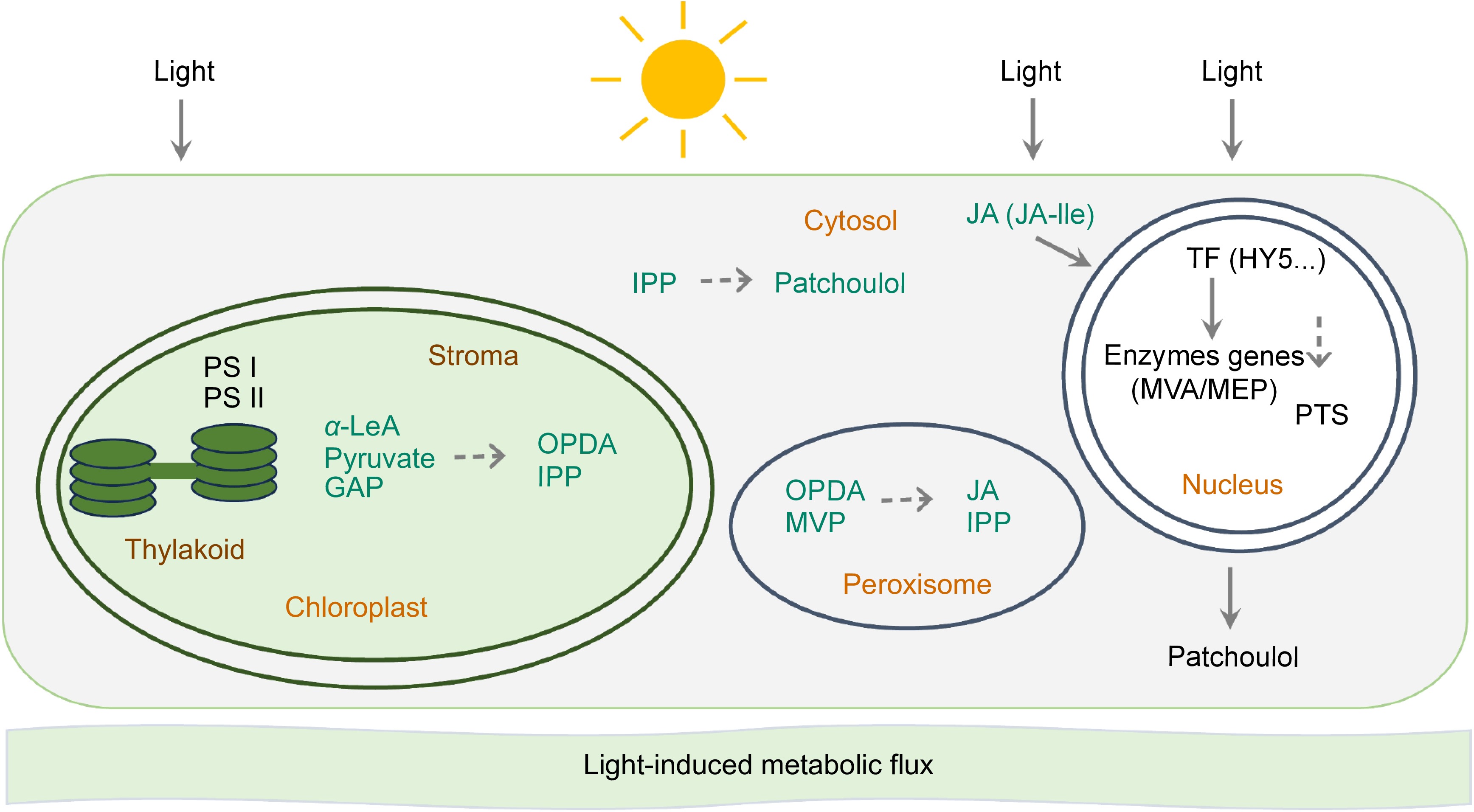 Jasmonates regulate light-induced patchoulol biosynthesis in P. cablin. Light may initiate a multi-layered regulatory network in P. cablin. Chloroplast-MEP axis: light induces MEP pathway genes, enhancing IPP production; plastid transporters export precursors to cytosol for patchoulol synthesis. Photosynthetic coupling: PSI/II-generated redox signals activate MEP enzymes while diverting carbon flux from competing pathways. JA-mediated regulation: light-stimulated OPDA synthesis in chloroplasts triggers JA-Ile signaling, activating MYC2 transcription factors that upregulate PTS and MEP genes. Photoreceptor cascades: phytochrome/cryptochrome-HY5 modules directly activate terpenoid biosynthetic genes through G-box promoter elements.