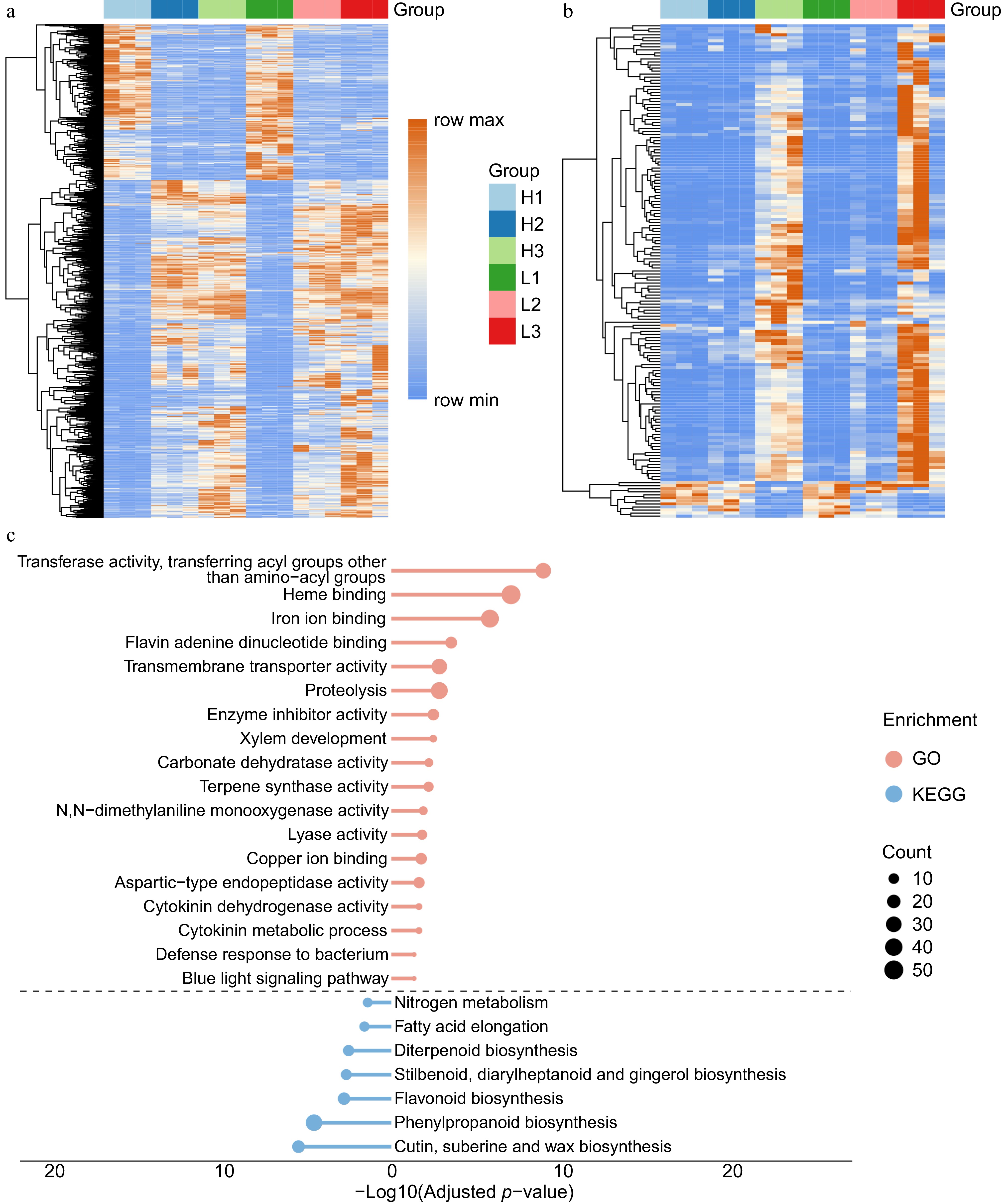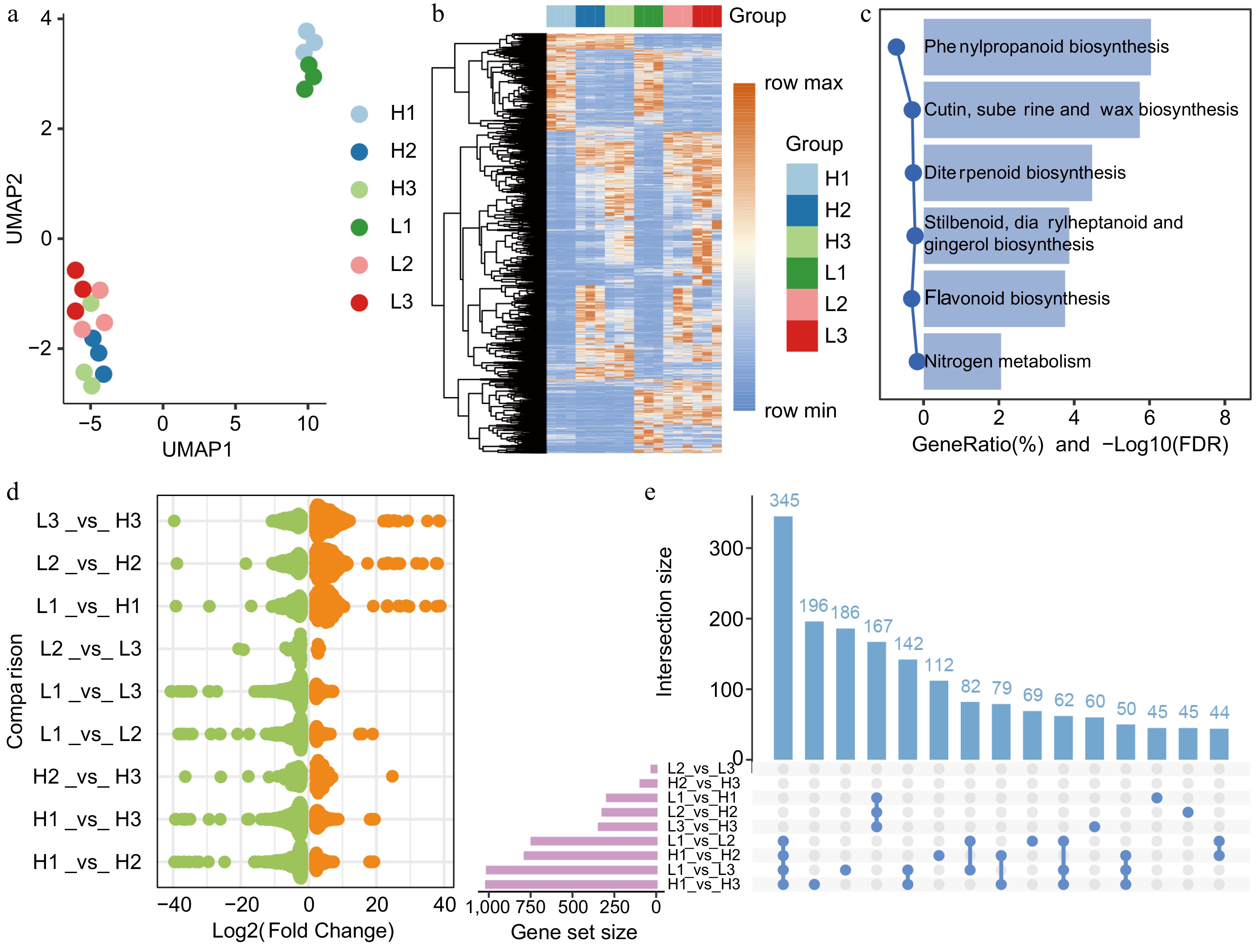 UMAP analysis indicates that biological replicates from samples at the same blooming stage exhibited high consistency (Fig. 1a), while noticeable heterogeneity was observed between the two genotypes (high yield (H) and low yield (L)) within the same period. This observation lays a foundational basis for subsequent research endeavors. Differential expression analysis identified a total of 2,013 differentially expressed genes (DEGs) across the three developmental stages. Hierarchical clustering based on the expression levels of all 2,013 DEGs uncovered dynamic expression patterns across the six groups (Fig. 1b). To elucidate the roles of DEGs in regulating biological pathways, we conducted KEGG enrichment analysis (Fig. 1c & Supplementary Table S1). These pathways suggest critical involvement in several essential processes, such as SM biosynthesis, regulation of plant development and adaptation, the structural integrity of the plant cuticle, and nitrogen utilization for metabolic efficiency. Collectively, these findings underscore the multifaceted regulatory roles of DEGs in coordinating developmental and environmental responses.