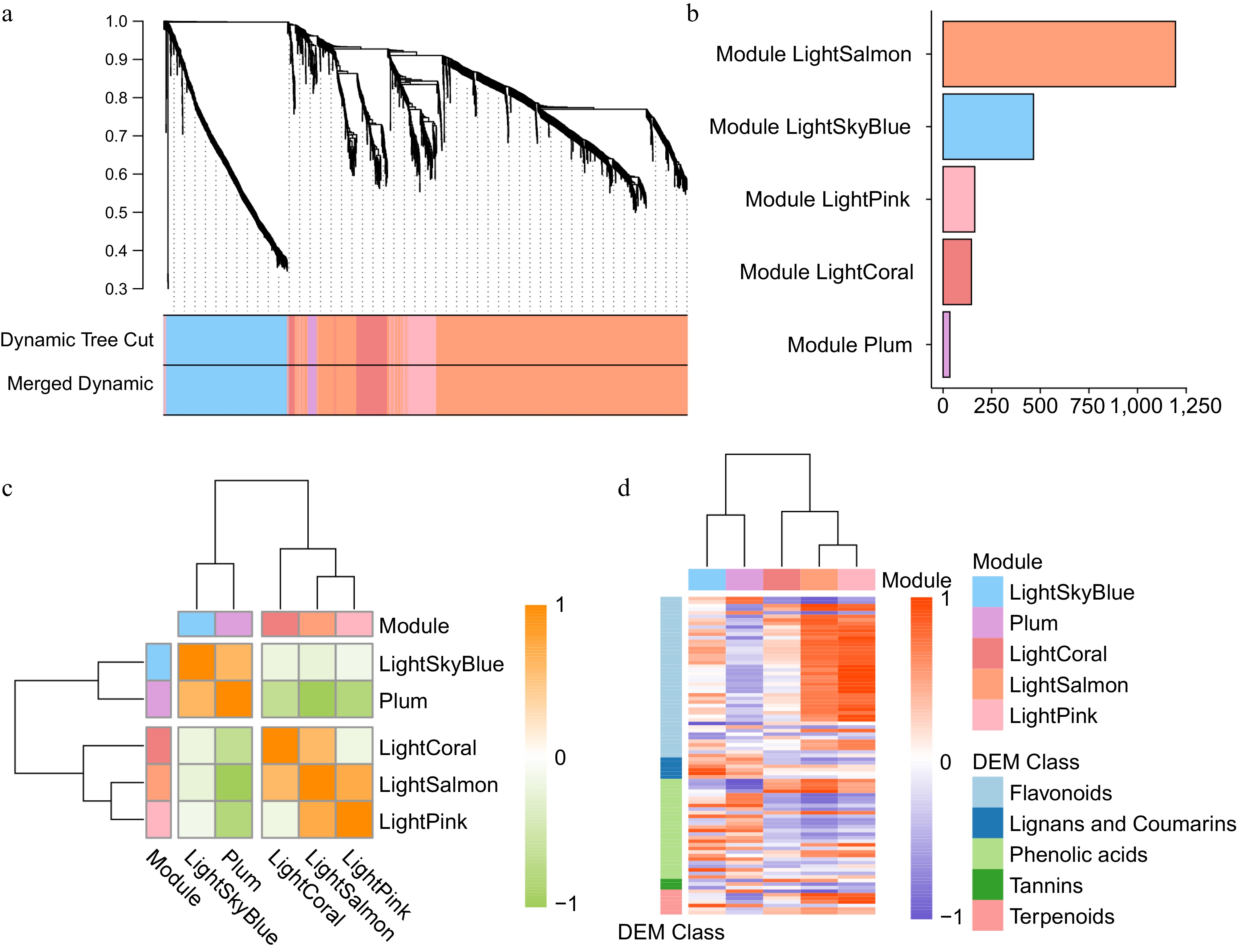 To further elucidate the roles of these modules in secondary metabolism, we correlated them with DEMs known to participate in secondary metabolic pathways during C. wilsoniana flower bud development (Fig. 3d). Our analysis revealed that the LightSalmon and LightPink modules were highly associated with the biosynthesis of flavonoids and terpenoids, while the LightSkyBlue and Plum modules showed a stronger correlation with lignin and coumarin pathways (Fig. 3d). These findings suggest that genes within these modules likely contribute to the early regulatory steps of secondary metabolism and may play critical roles in the plant’s environmental response mechanisms during flower bud development.
