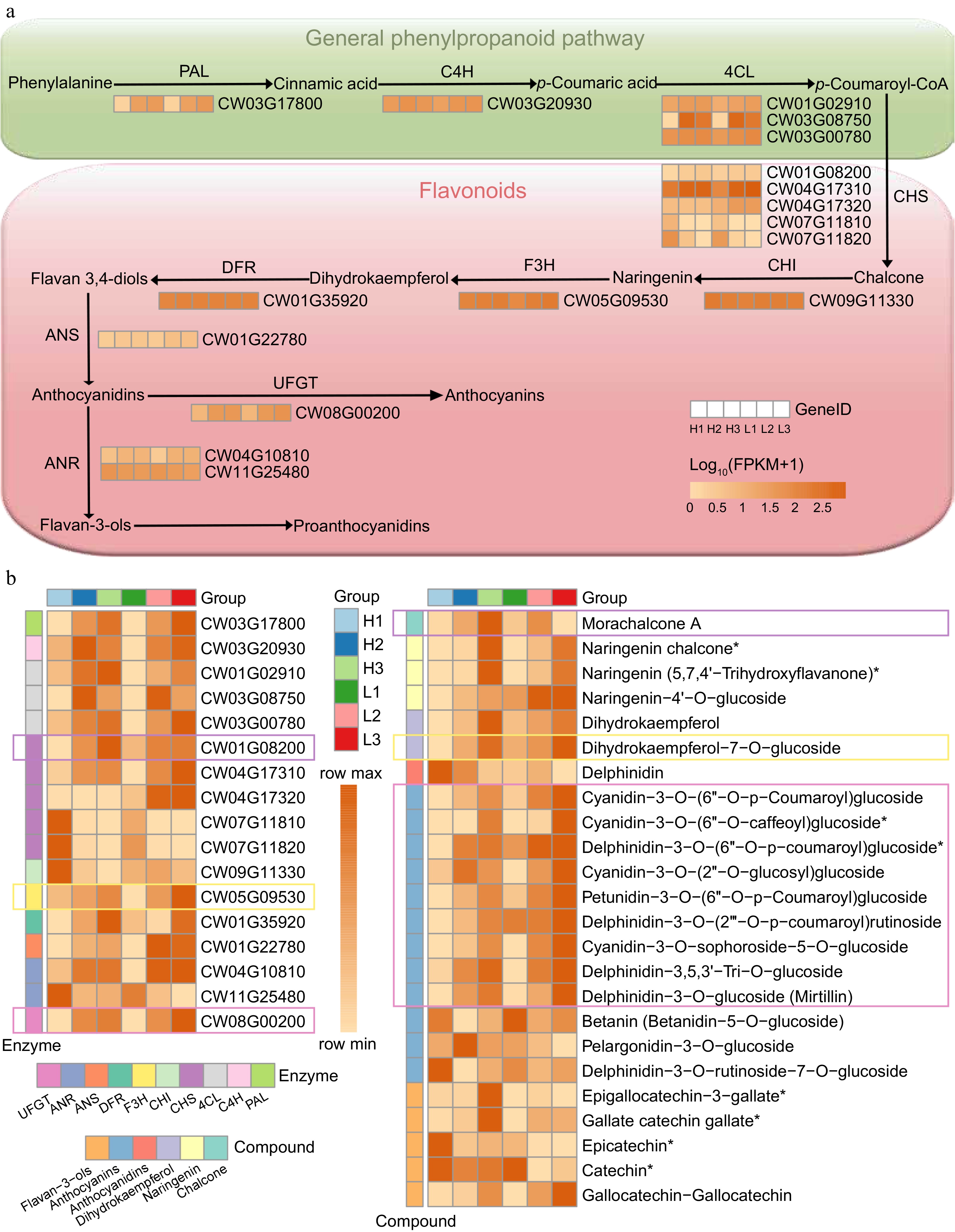 Genes involved in flavonoid biosynthesis. (a) A simplified representation of the flavonoid biosynthesis pathway, where the expression levels of each gene were estimated based on FPKM from RNA sequencing of flower bud tissue from high-yield and low-yield genotypes. (b) A heatmap of the expression abundances of key enzymes and metabolites in the anthocyanin pathway during the flower bud development stages, with expression levels standardized by the Max-Min method. Rectangles of different colors represent enzymes and metabolites with similar expression patterns. * indicates metabolites with possible structural isomers.