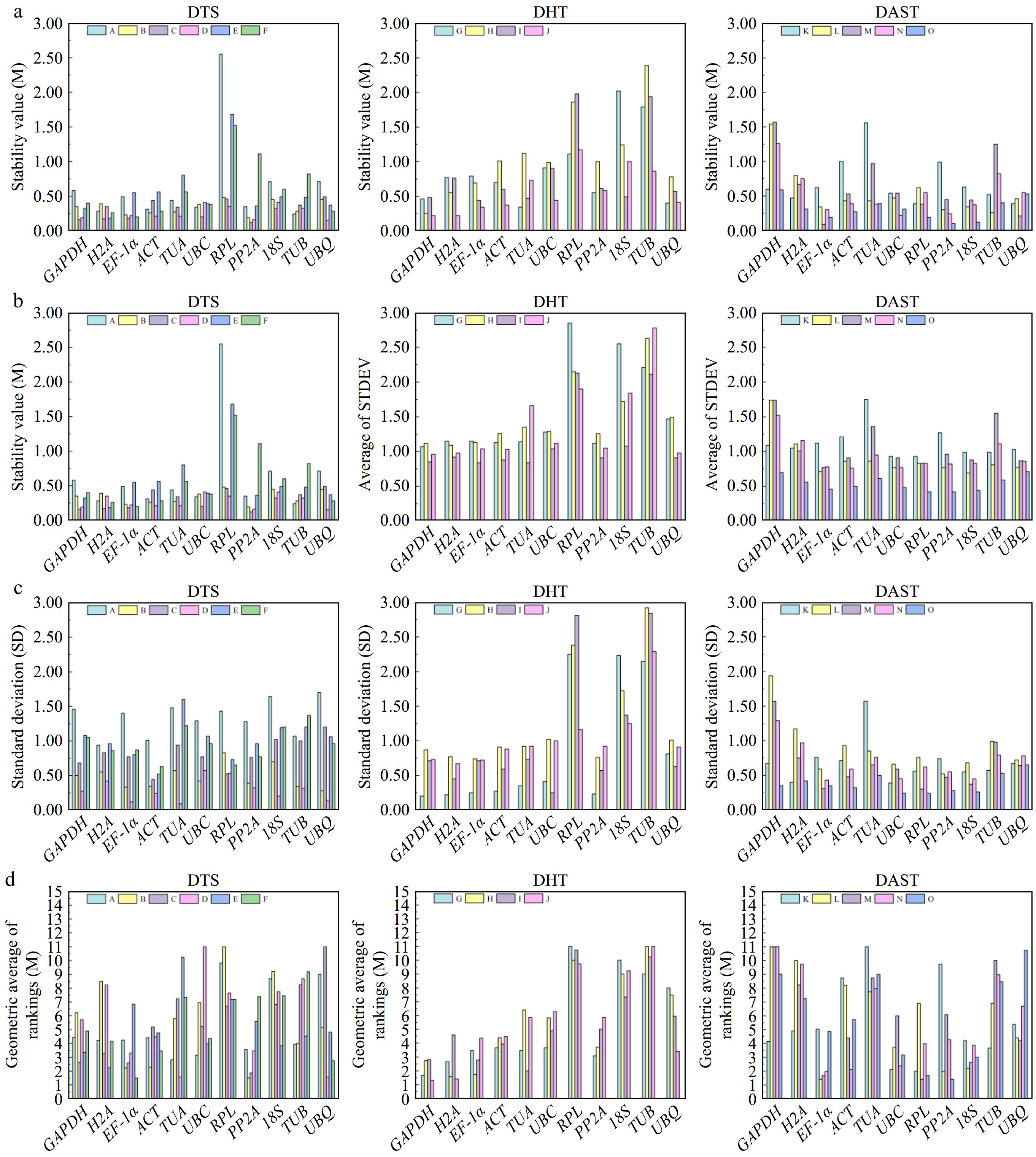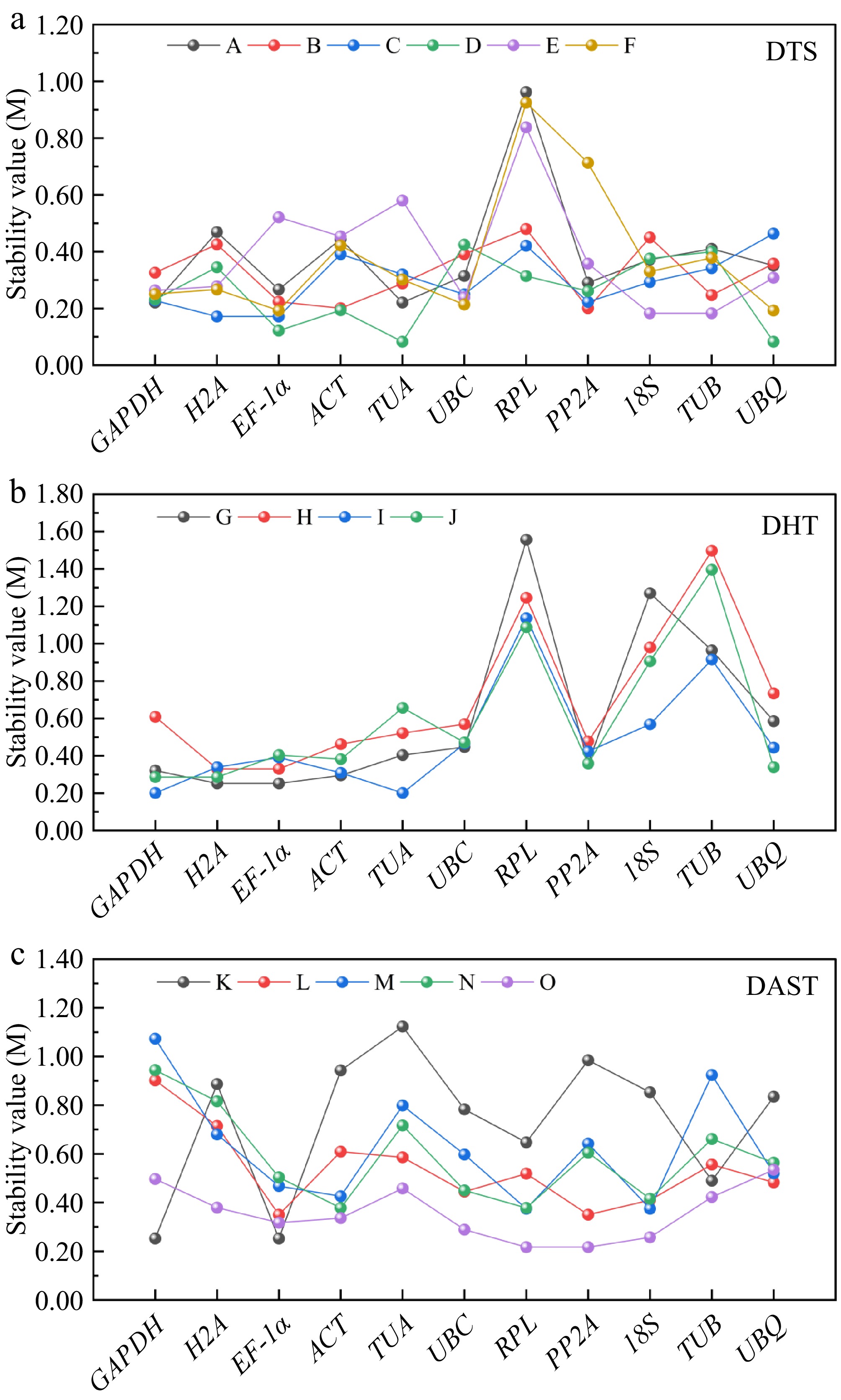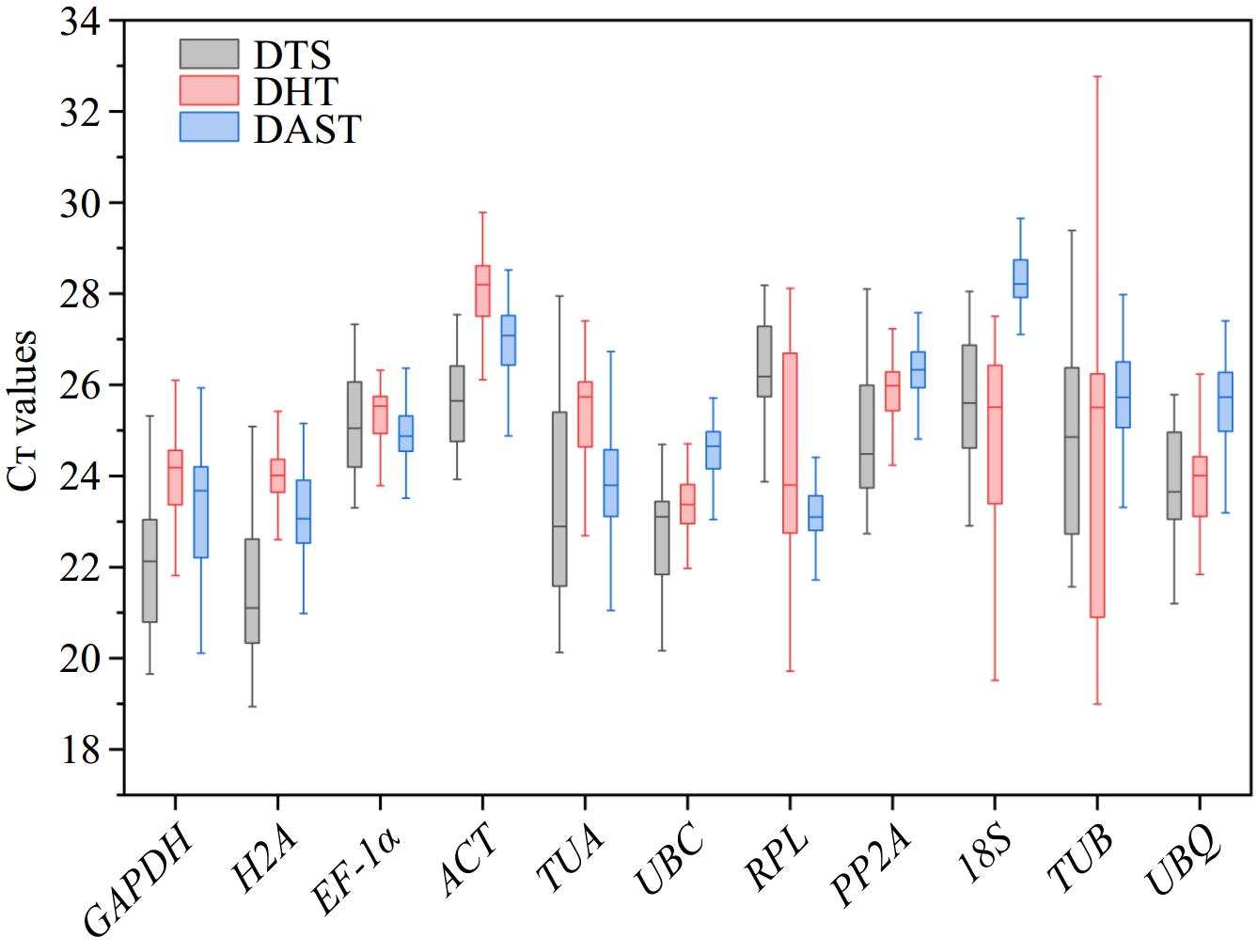 • Cᴛ values of the 11 candidate reference genes were analyzed across three groups (DTS, DHT, and DAST) to evaluate their expression stability and abundance. As shown in Fig. 1, the DTS group exhibited significant Cᴛ value variability, indicating poor overall stability. Specifically, H2A had the lowest Cᴛ value (18.93−25.08), reflecting the highest expression abundance, while RPL had the highest Cᴛ value (23.87−28.18), indicating the lowest expression abundance. In the DHT group, except for RPL, 18S, and TUB, which showed relatively poor stability, other reference genes demonstrated smaller fluctuations and better overall stability. Notably, UBC had the lowest Cᴛ value (21.02−26.60), indicating the highest expression abundance, whereas ACT had the highest Cᴛ value (26.11−30.43), indicating the lowest expression abundance. In the DAST group, Cᴛ values of the 11 candidate reference genes showed minimal variation, suggesting good stability. Particularly, RPL had a low Cᴛ value range (21.63−25.11) with minimal fluctuation, indicating high expression abundance and excellent stability. Conversely, TUB had the highest Cᴛ value (22.86−30.44), indicating the lowest expression abundance. These findings suggest that there are significant differences in the expression levels of different reference genes in P. hunanense under varying tissue conditions, hormone inductions, and abiotic stress treatments.