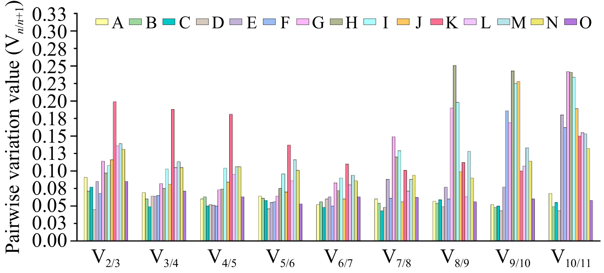 GeNorm can also determine the most suitable number of reference genes by calculating the pairwise variation (Vn/n+1) of the normalization factors of candidate reference genes to obtain accurate and reliable results. When Vn/n+1 < 0.15, the represented genes can meet the requirements for correcting the expression levels of target genes[28]. As depicted in Fig. 3, the GeNorm analysis reveals that, with the exception of the high-temperature treatment condition, the V2/3 values under the 14 experimental conditions, encompassing six tissue sites, four hormone groups, and four abiotic stress groups, are all significantly lower than 0.15. This indicates that the application of a dual internal reference gene combination can offer adequate precision for standardization in these 14 samples, enabling normalization. This systematic assessment validates the adequacy of the dual reference gene set for precise quantification within these biological contexts.
