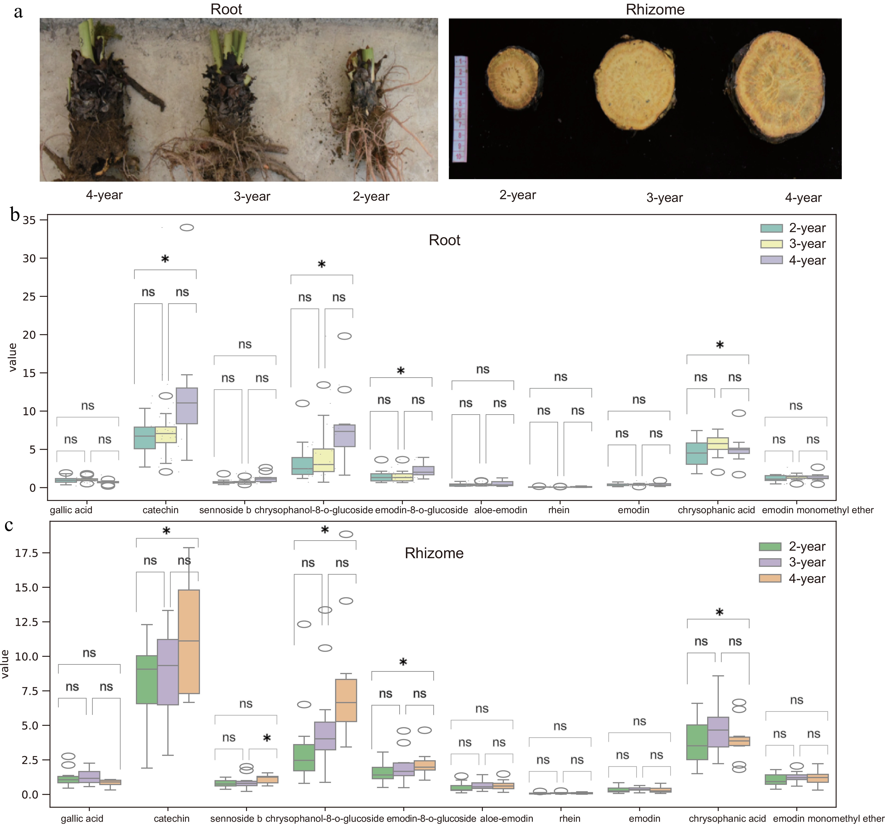 • In this study, the levels of ten bioactive components was evaluated across different years of root and rhizome specimens of R. officinale. The analysed compounds included gallic acid, catechin, sennoside B, chrysophanol-8-O-glucoside, emodin-8-O-glucoside, aloe-emodin, rhein, emodin, chrysophanic acid, and emodin monomethyl ether (Fig. 1a). Specifically, in root samples, seven bioactive components, including catechin, sennoside B, chrysophanol-8-O-glucoside, emodin-8-O-glucoside, aloe-emodin, emodin, and emodin monomethyl ether, exhibited higher concentrations in 4-year-old specimens compared to those aged 2 and 3 years (Fig. 1b). In rhizome samples, six bioactive components exhibited levels in 4-year-old specimens relative to those aged 2 and 3 years, including catechin, sennoside B, chrysophanol-8-O-glucoside, emodin-8-O-glucoside, aloe-emodin, and emodin monomethyl ether (Fig. 1c). These findings indicate the accumulation of six common bioactive components over time (Fig. 2b, c). Additionally, higher levels of chrysophanic acid was observed in 3-year-old specimens compared to those aged 2 and 4 years in both root and rhizome samples (Fig. 2b, c). Collectively, the results obtained suggest that 4-year-old R. officinale root and rhizome specimens exhibit elevated levels of bioactive components.