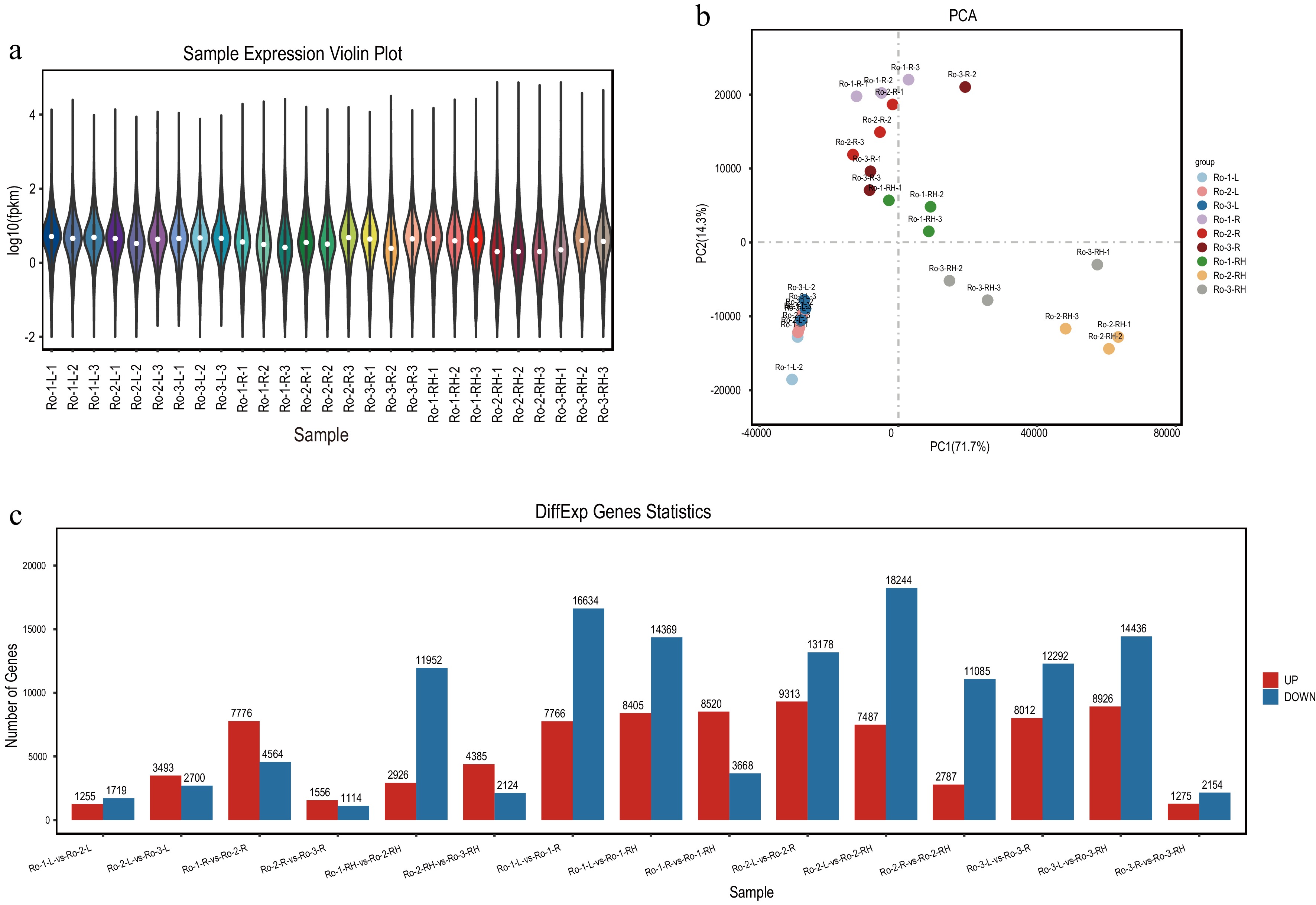 • RNA-seq analysis revealed consistent unigene expression patterns across roots, rhizomes, and leaves of Rheum officinale across different ages, as evidenced by the average Fragments Per Kilobase of transcript per Million mapped reads (FPKM) box plot and Principal Component Analysis (PCA) (Fig. 2a). PCA further illustrated distinct sample separations (Fig. 2b). Following differential expression gene (DEG) screening method, considerable numbers of upregulated and downregulated DEGs were identified: 1,255 up and 1,719 down DEGs between RO-1-L and RO-2-L; 3,493 up and 2,700 down DEGs between RO-2-L and RO-3-L; 7,776 up and 4,564 down DEGs between RO-1-R and RO-2-R; 1,556 up and 1,114 down DEGs between RO-2-R and RO-3-R; 2,926 up and 11,952 down DEGs between RO-1-RH and RO-2-RH; 4,385 up and 2,124 down DEGs between RO-2-RH and RO-3-RH; 7,766 up and 16,634 down DEGs between RO-1-L and RO-1-RH; 8,405 up and 14,369 down DEGs between RO-1-L and RO-1-RH; 8,520 up and 3,668 down DEGs between RO-1-R and RO-1-RH; 9,313 up and 13,178 down DEGs between RO-2-L and RO-2-R; 7,487 up and 18,244 down DEGs between RO-2-L and RO-2-RH; 2,787 up and 11,085 down DEGs between RO-2-R and RO-2-RH; 8,012 up and 12,292 down DEGs between RO-3-L and RO-3-R; 8,926 up and 14,436 down DEGs between RO-3-L and RO-3-RH; 1,275 up and 2,154 down DEGs between RO-3-R and RO-3-RH (Fig. 2c). These findings underscore the substantial presence of DEGs within each group.