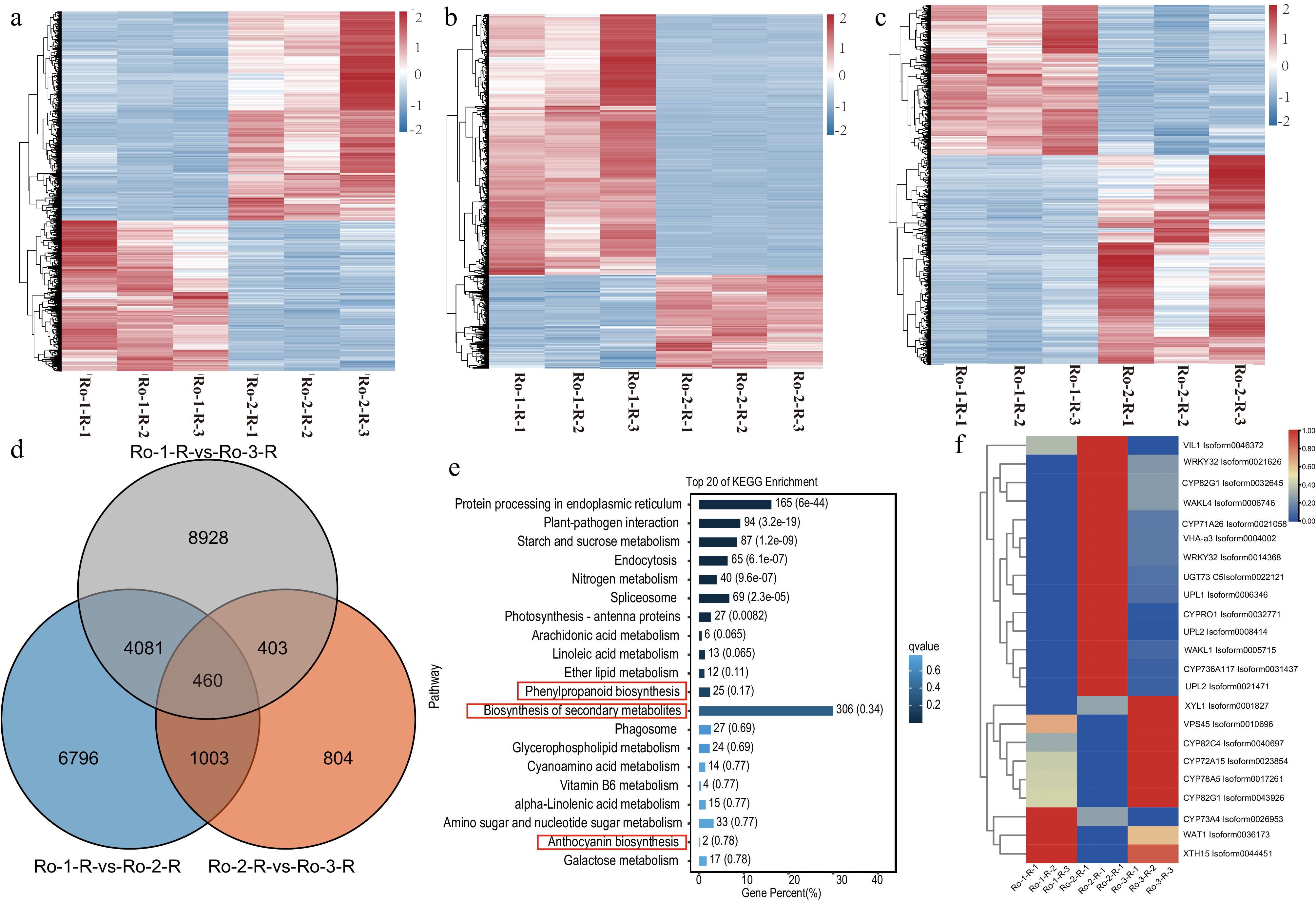 The comparative transcriptomic analysis of R. officinale during three ages of roots. (a)−(c) The heatmap of DEGs during three ages of roots of R. officinale. (d) The Venn plot of DEGs at three ages of R. officinale. (e) The KEGG enrichment analysis of DEGs at three ages. (e) The heatmap of significantly differential unigenes during three stages of roots of R. officinale. Ro-1-R: 2021-9; Ro-2-R: 2021-9; Ro-3-R: 2022-9.