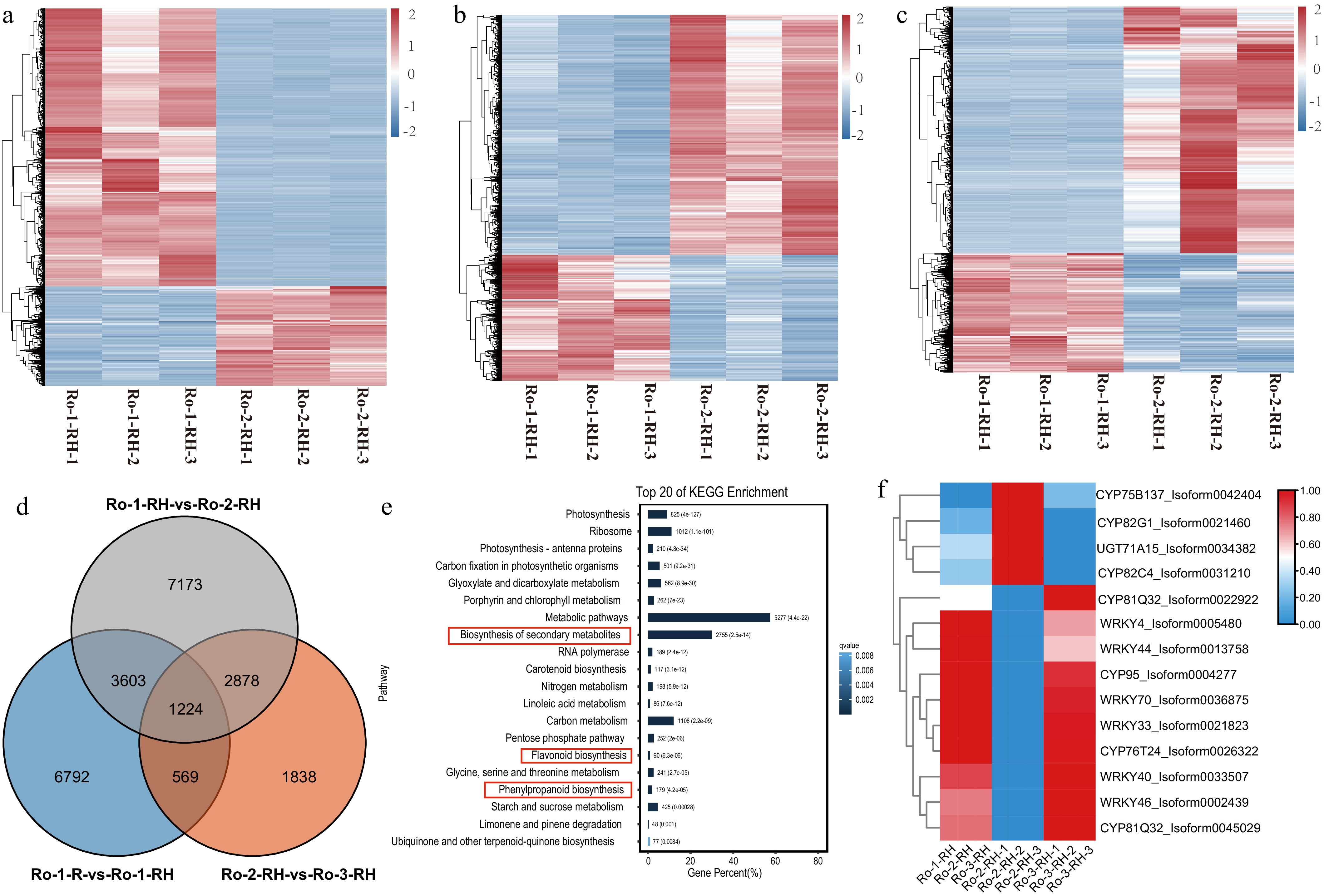 The comparative transcriptome at three ages of rhizomes of R. officinale. (a)−(c) The heatmap of DEGs during three ages of rhizomes of R. officinale. (d) The Venn plot of DEGs during three ages of R. officinale. (e) The KEGG enrichment analysis of DEGs between CK and MeJA treatment. (f) The heatmap of significantly differential unigenes during three stages of rhizomes of R. officinale. RO-1-RH: 2020-9-1; RO-2-RH: 2021-9-1; RO-3-RH: 2022-9-1.