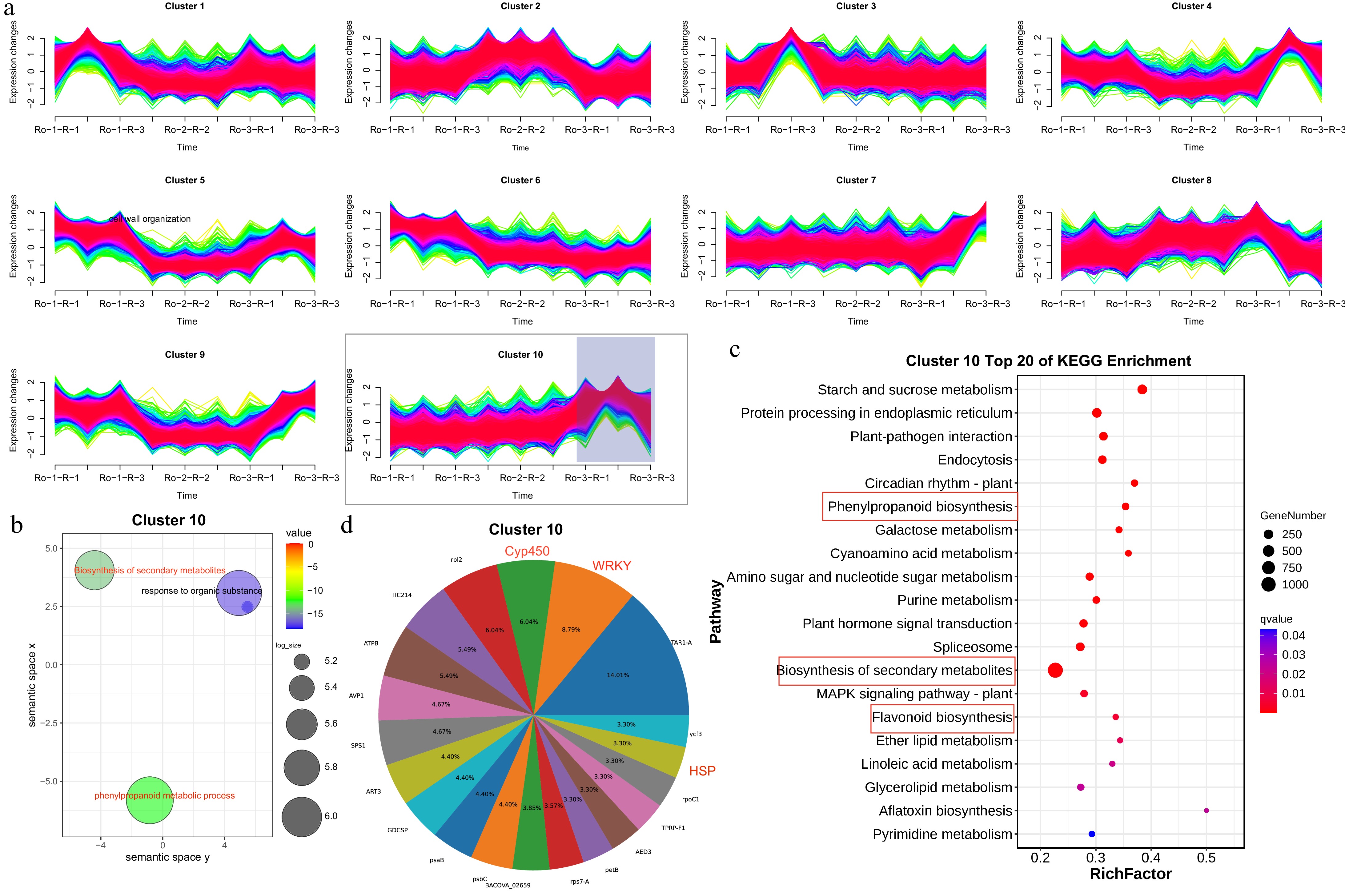 Spatiotemporal gene expression pattern of R. officinale roots and functional enrichment analysis. (a) Cluster 1 to 10 showing DEGs in RO-1-R, RO-1-R, and RO-1-R. (b) GO enrichment pathway analysis of DEGs from cluster 10. (c) KEGG enrichment pathway analysis of DEGs from cluster 10. (d) The gene family cluster analysis of cluster 10.